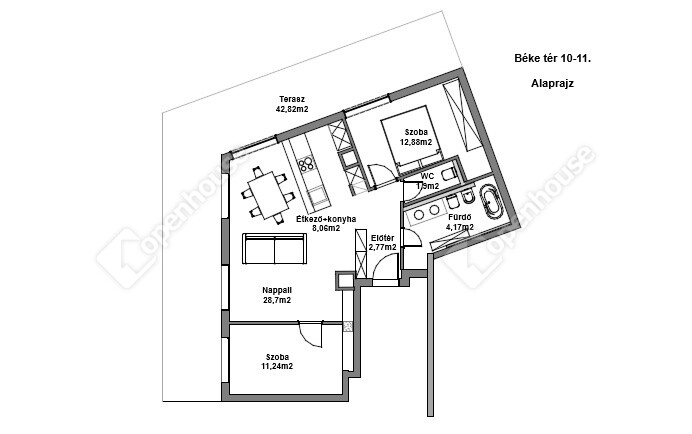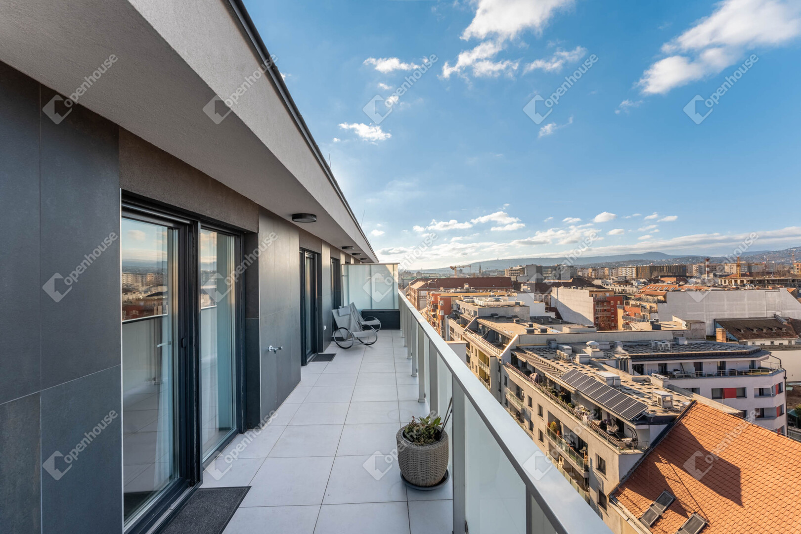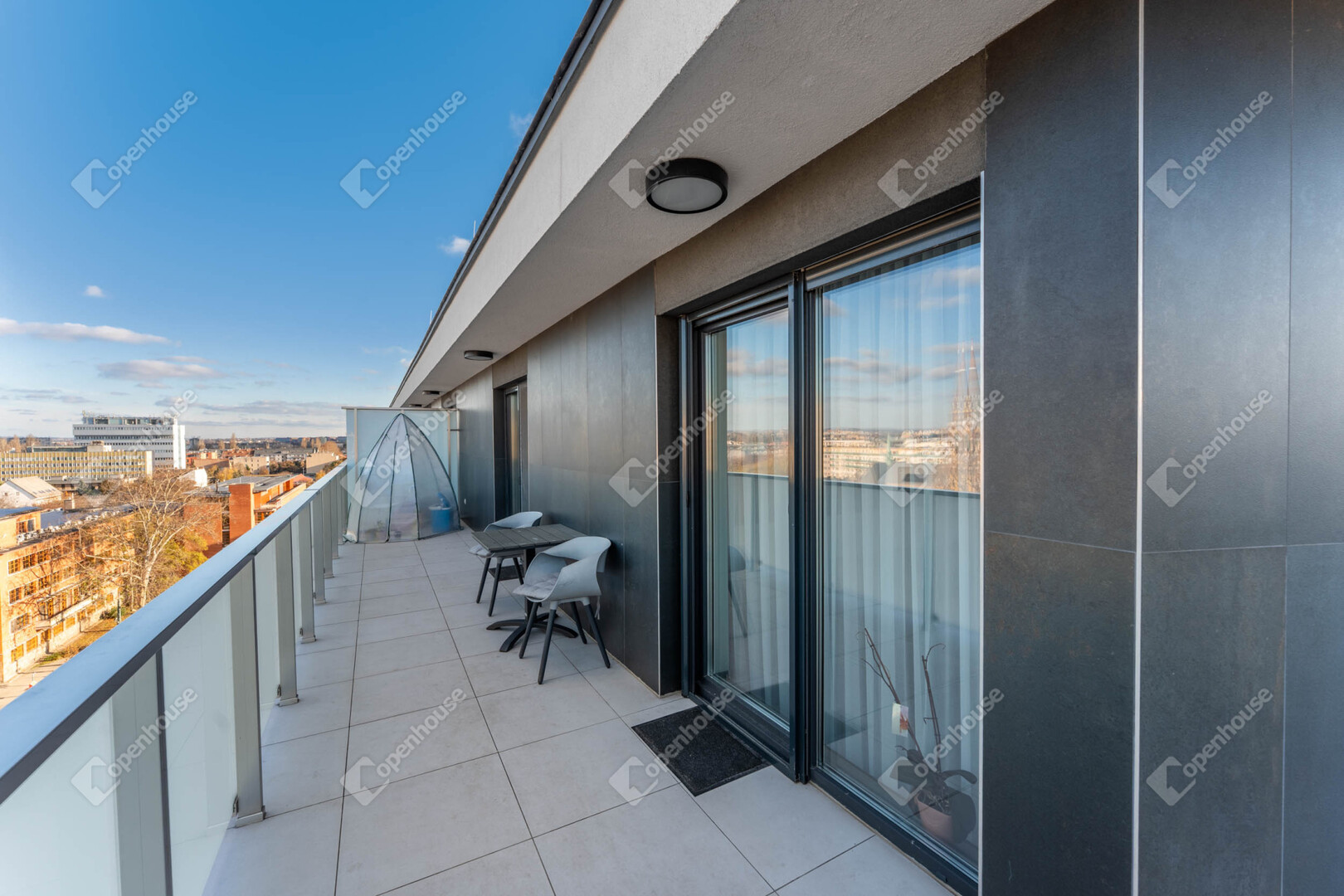 Ez a terasz nem csupán kiegészítője a lakásnak, hanem önálló lakóterület: egy olyan szelet, ahol a város ritmusa és az otthon csendje találkozik, és ahol könnyű elképzelni, hogyan néz ki itt egy átlagos este vagy egy hétvégi reggel: Van hely a nagy étkezőasztalnak, a függőszéknek, napozóágyaknak, növényeknek, egy kisebb jakuzzinak.