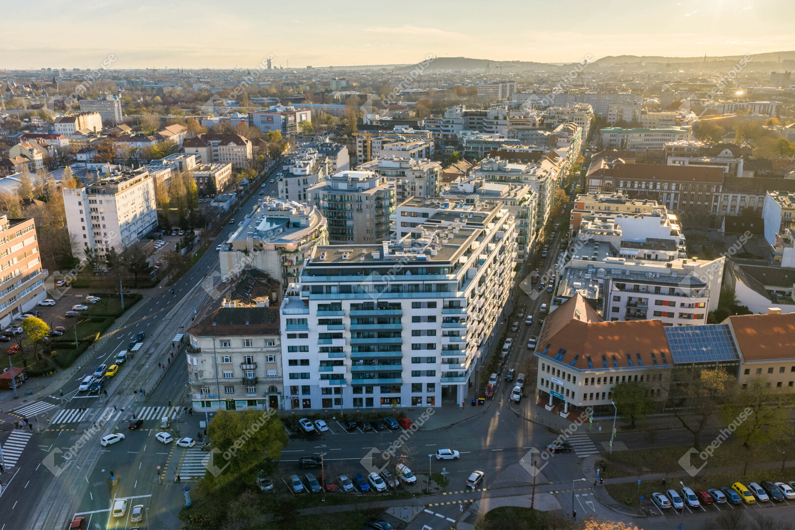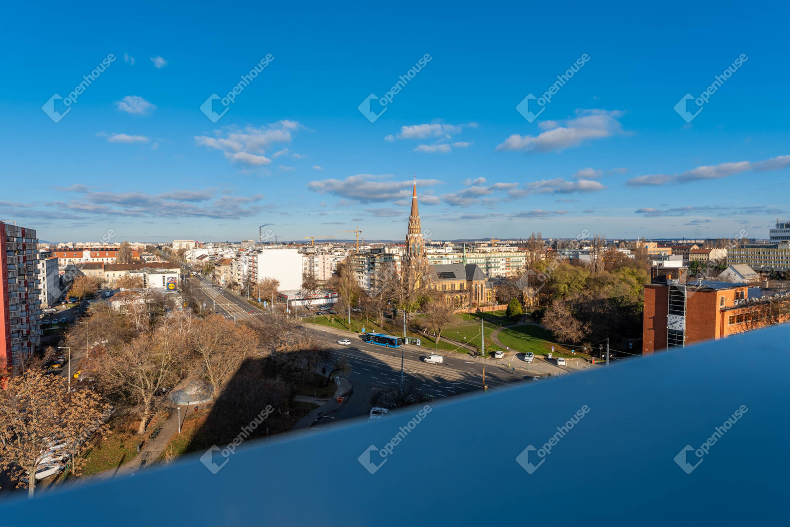 Budapest XIII. kerületében, Angyalföld egyik legújabb fejlesztésében, a 2023-ban átadott Béke Residence-ben található ez a 70 m²-es, nappali + két hálós penthouse lakás, 44 m²-es, teljes hosszban futó terasszal és elvehetetlen panorámával a Budai Várra, a Normafára és a Szent László templomra.