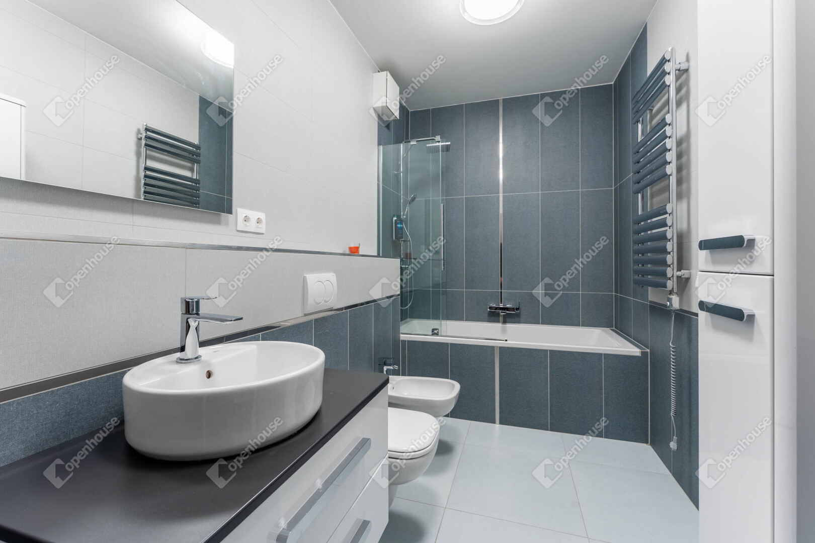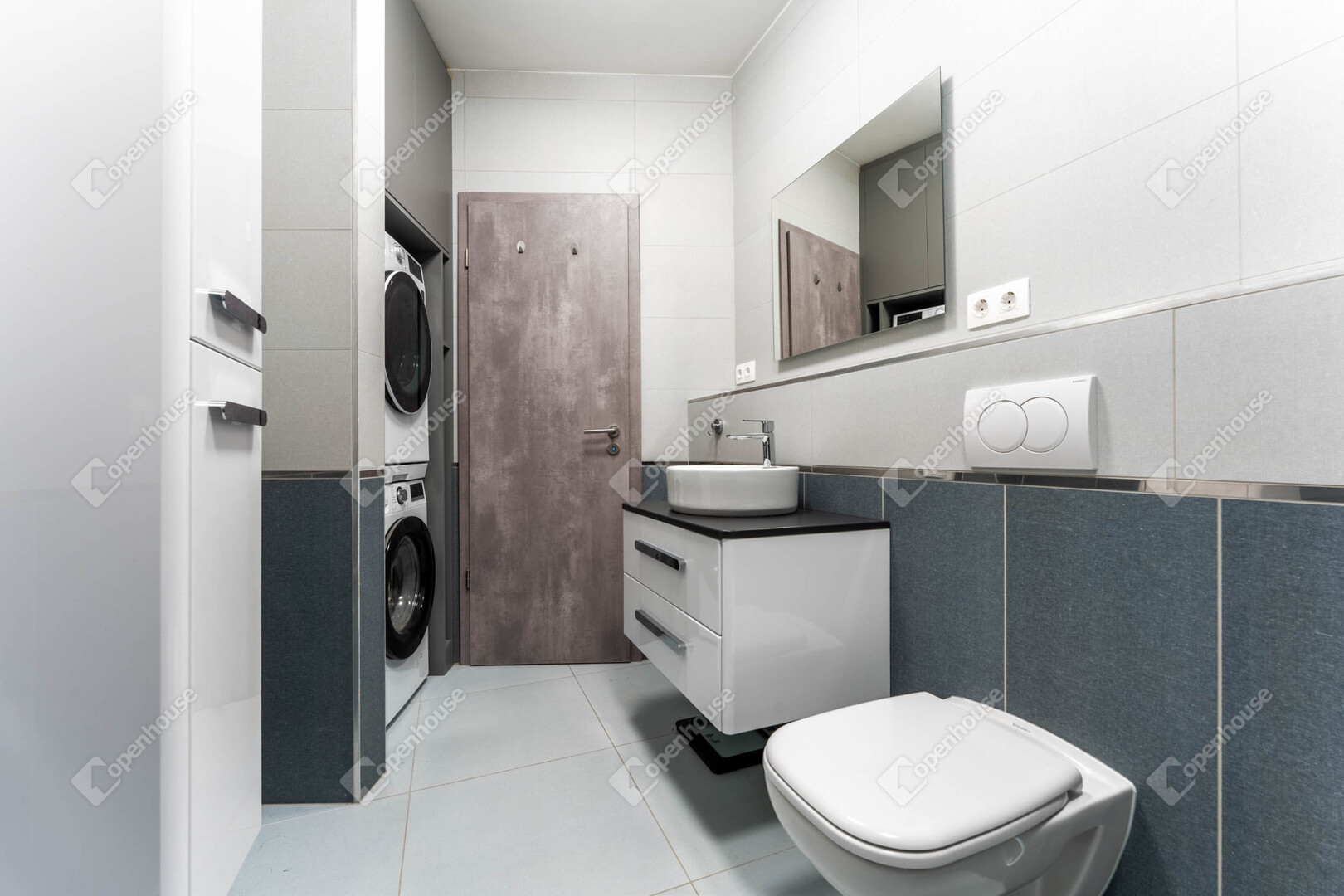 Letisztult, modern hangulat fogad a fürdőben: a nagyméretű szürke burkolatok nyugodt, rendezett hátteret adnak, a fehér szaniterek pedig tiszta kontrasztot teremtenek. A beépített kád kényelmes méretű, fölötte üvegfallal elválasztott zuhanykeret ad praktikus pluszt, így a helyiség két funkciót is gond nélkül kiszolgál.