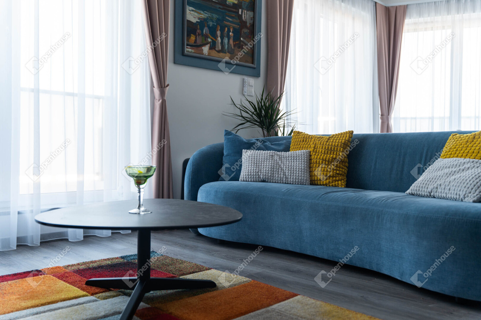 A nappali a lakás legnyitottabb pontja: nagy üvegfelületein át folyamatosan érkezik a természetes fény, amely könnyed, levegős hangulatot ad a térnek.