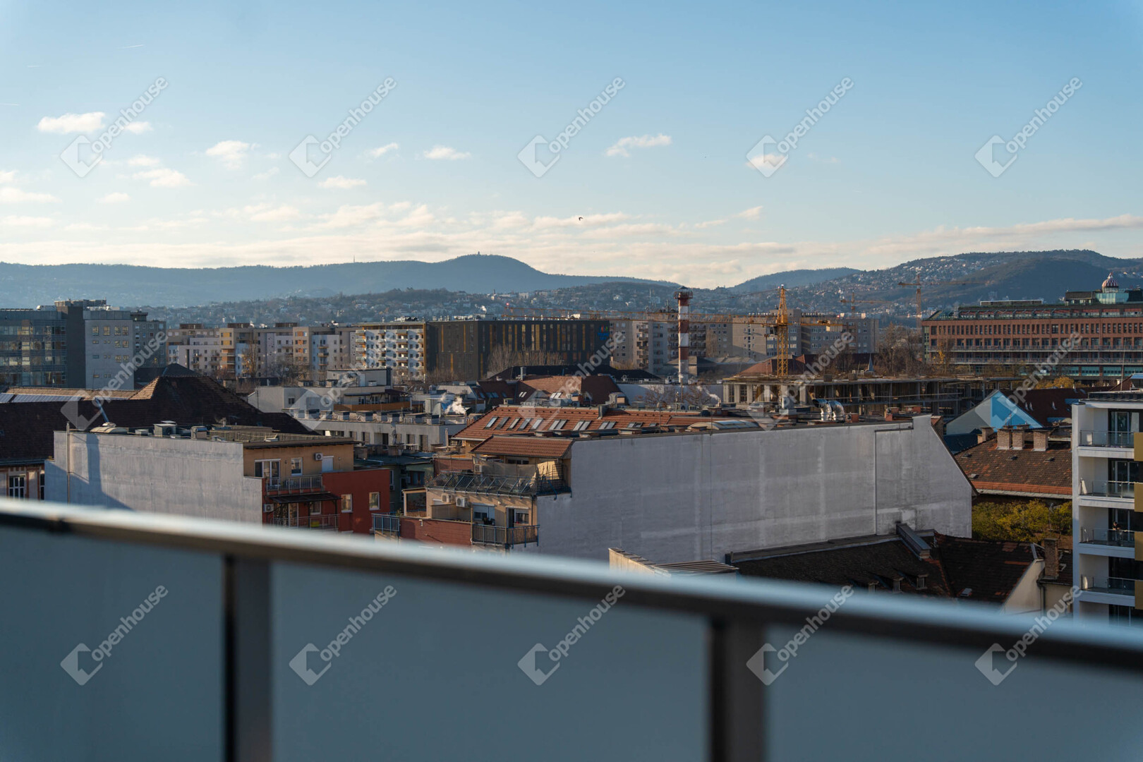A burkolat világos árnyalata és a matt üvegkorlát elegáns keretet adnak, így a figyelem szinte automatikusan a panorámára irányul. A Budai Vár, a Normafa, a Szent László-templom és a zöld dombok vonala minden napszakban más arcát mutatja: reggel tiszta, határozott kontúrok, estére puhább, rózsaszínes fények – a városnak ez a része kifejezetten látványos a magasból.