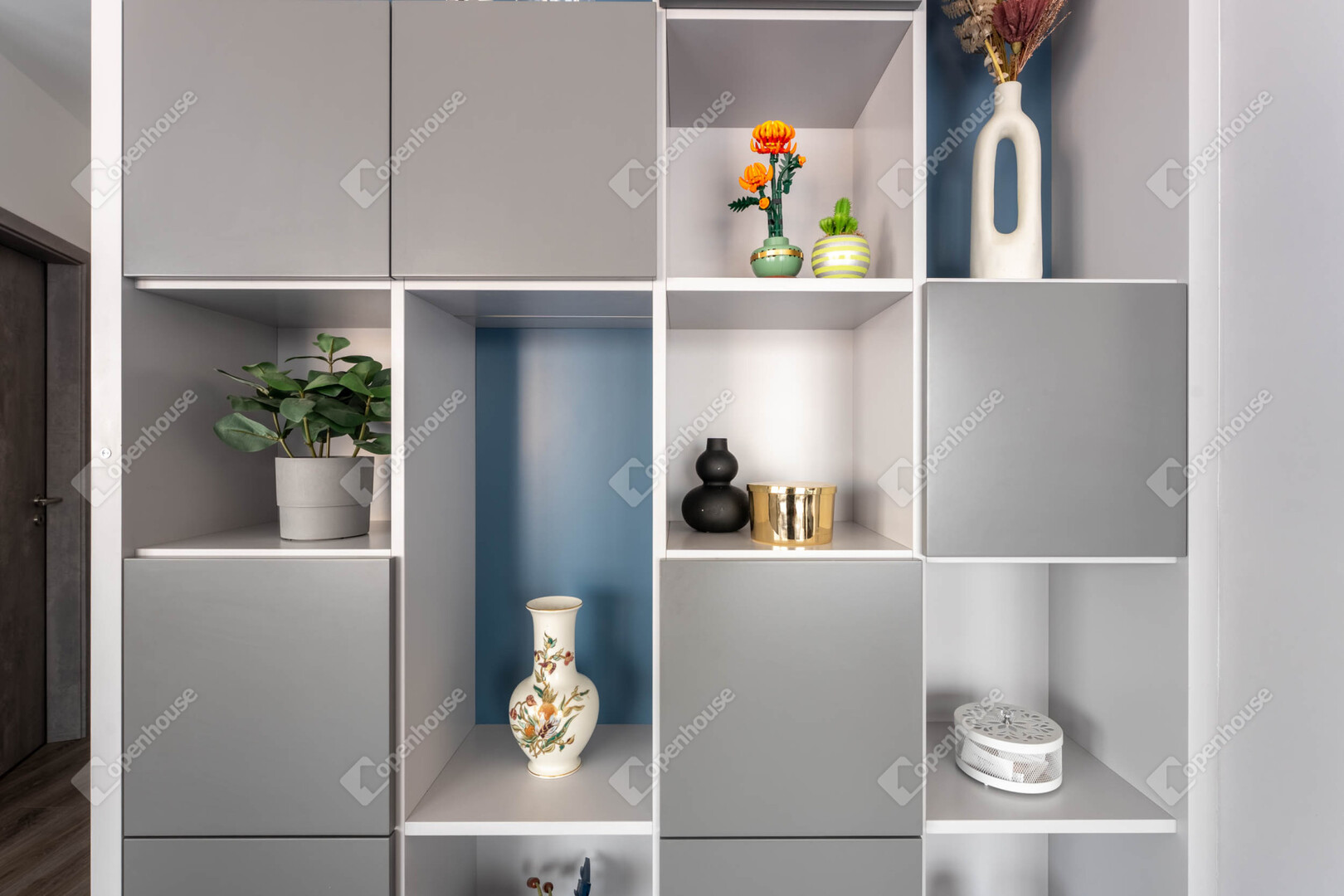 Már az előszoba is jelzi, hogy itt minden részlet összehangolt. A szürke és kék árnyalatok visszafogott eleganciája végigkíséri az egész lakást, a mozgásérzékelős LED fények pedig diszkrét ritmust adnak a tereknek.