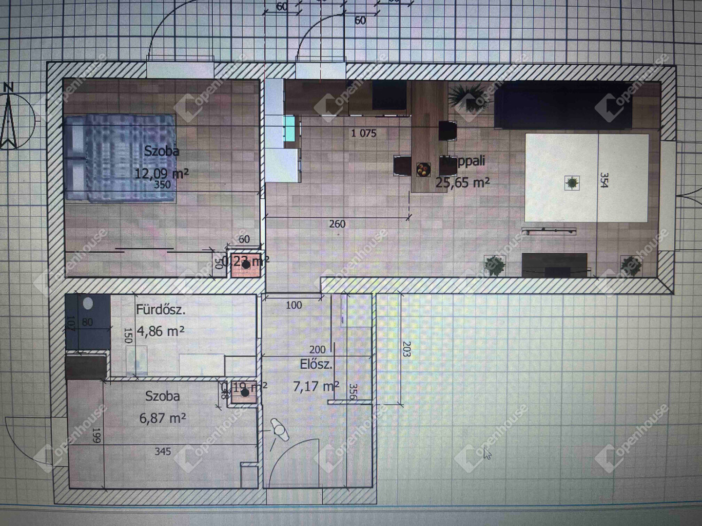 nappali + 2 külön nyíló szoba