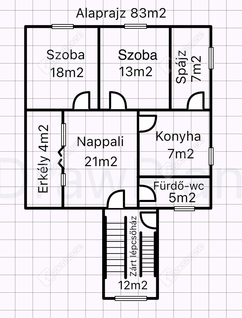 -Helyiségek 83m2 alapterületen: kettő szoba, konyha, spájz, nappali, fürdő-wc, zárt lépcsőház, plussz 4m2 erkély.