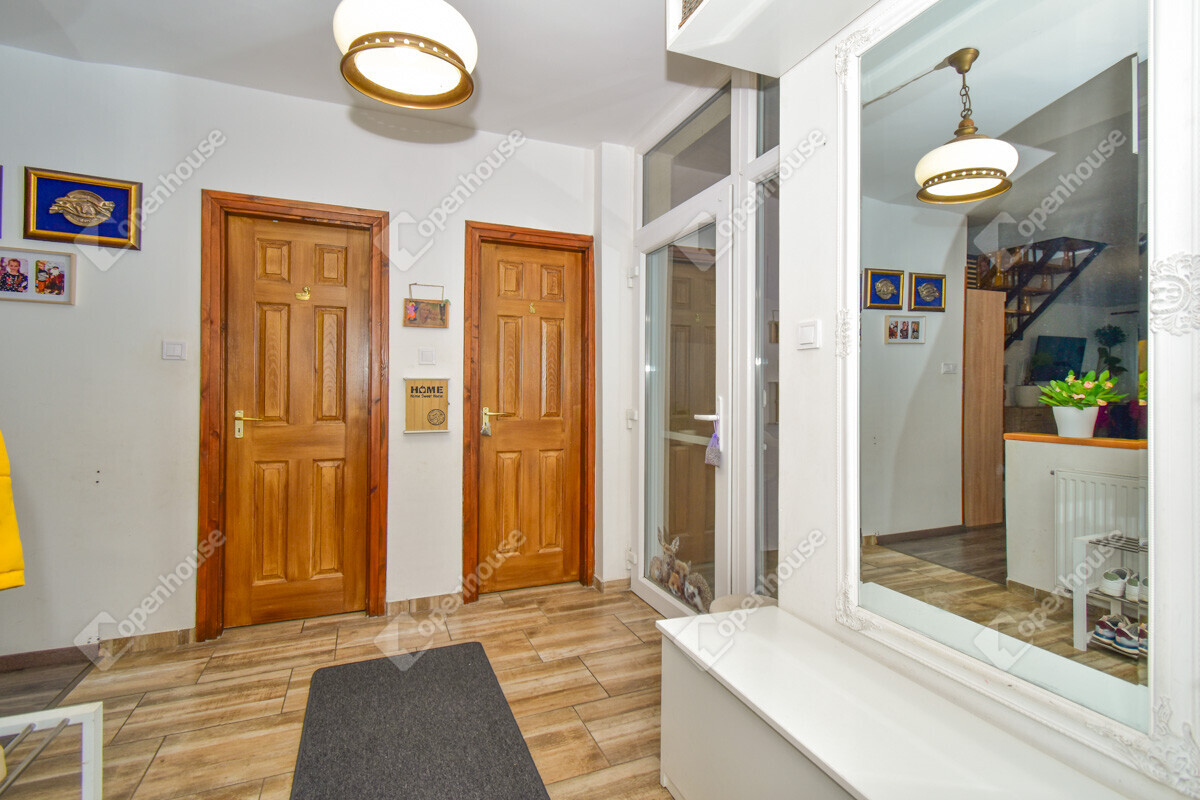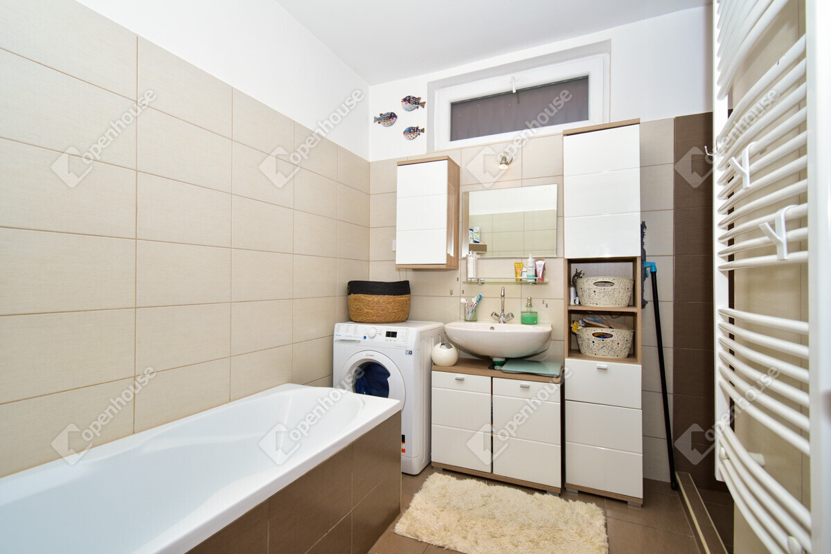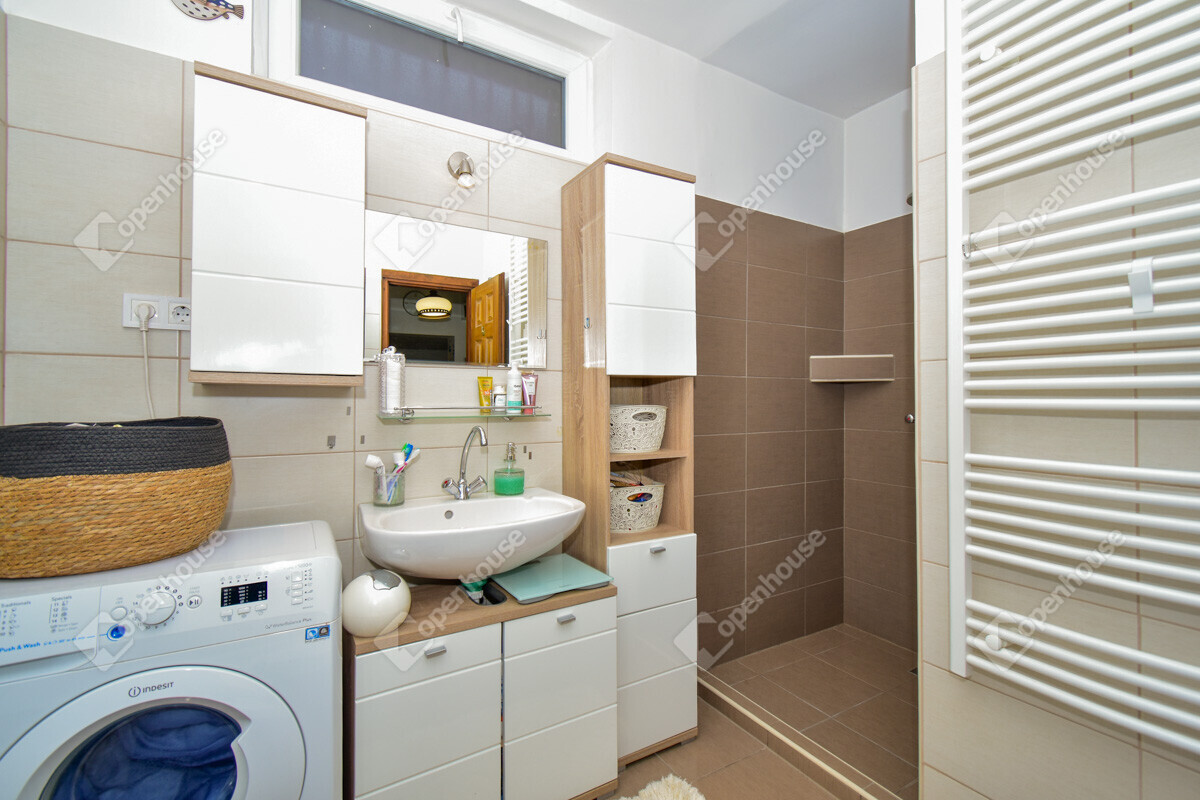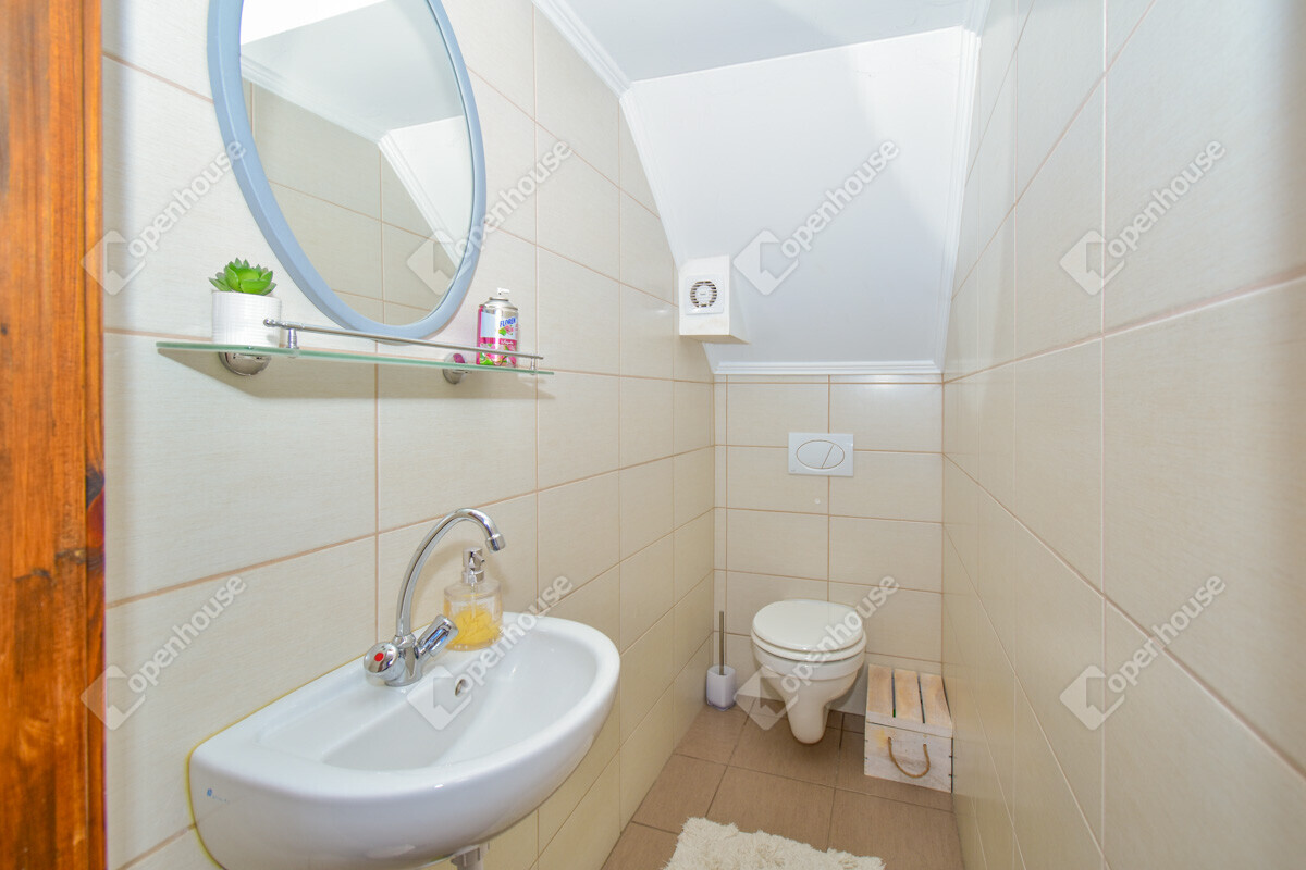 Földszinten: kádas–tusolós fürdőszoba, külön WC