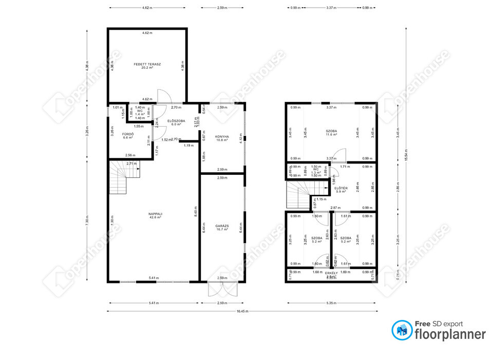 Emeleten: három különnyíló szoba, saját WC, erkély