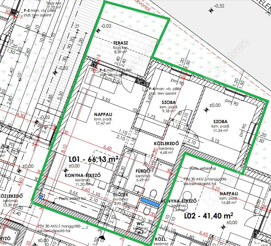 L1 számú lakás: földszinti 66,13 m2 alapterületű, 2 szoba nappali elrendezésű, 8,39 m2 terasszal.