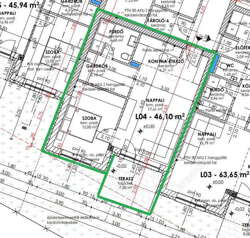 L4 számú lakás: földszinti 46,1 m2 alapterületű, 1 szoba nappali elrendezésű, 7,5 m2 terasszal.