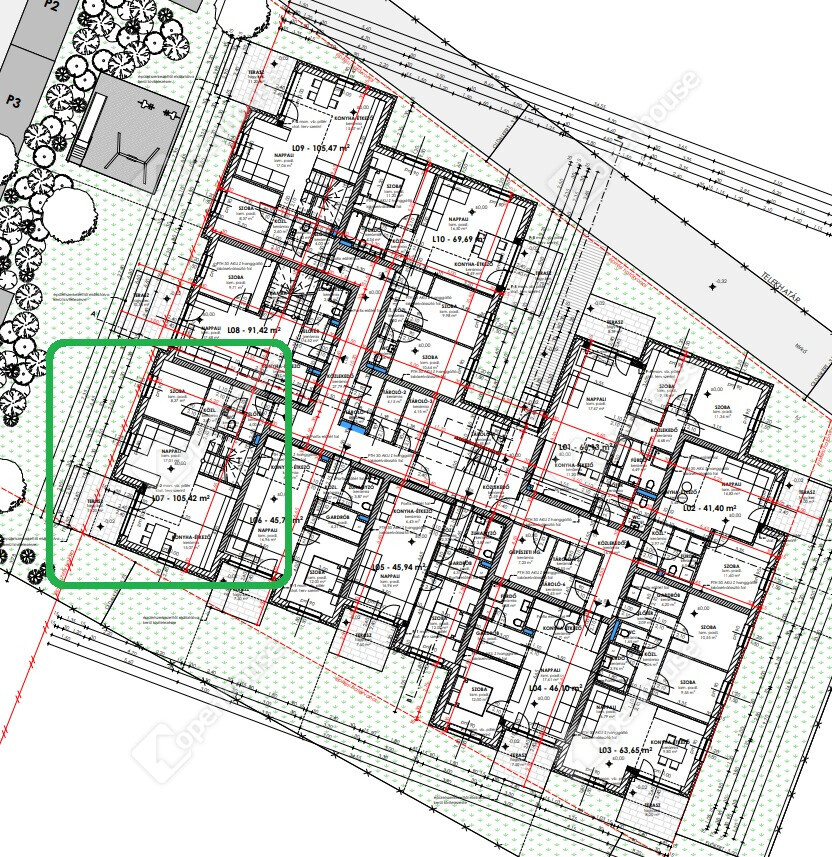 L7 számú lakás: földszinti 105,42 m2 alapterületű, 4 szoba nappali elrendezésű, 11,2 m2 terasszal + 153 m2 kertkapcsolat
