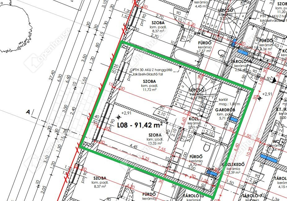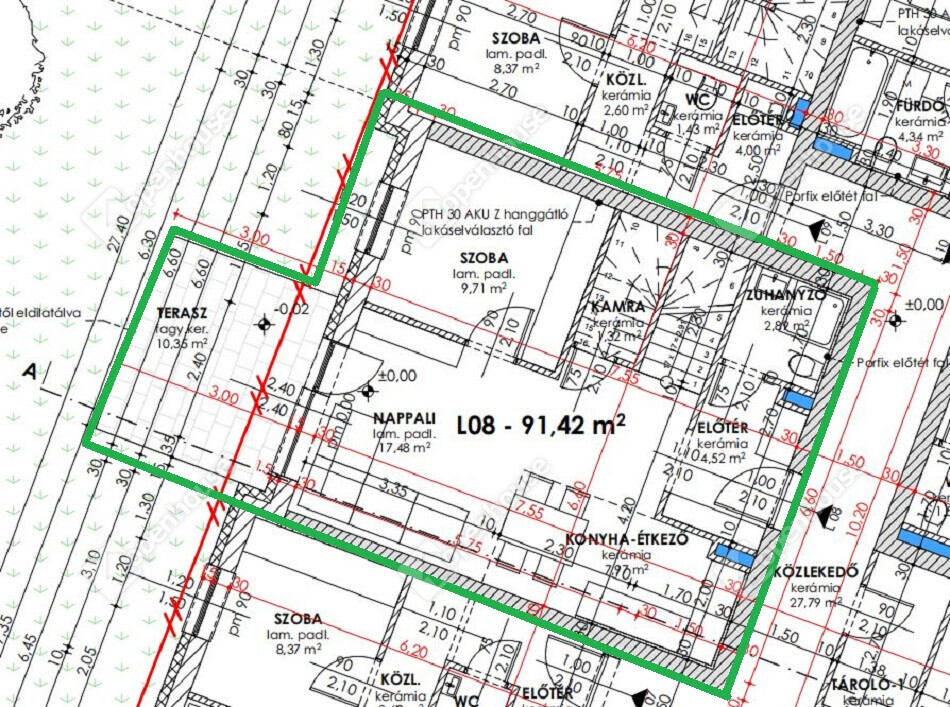 L8 számú lakás: földszinti 91,42 m2 alapterületű, 3 szoba nappali elrendezésű, 10,36 m2 terasszal.