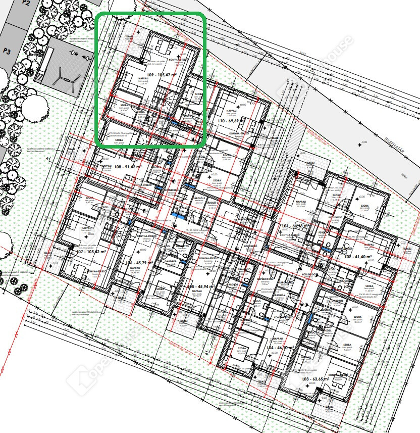 L9 számú lakás: földszinti 105,47 m2 alapterületű, 4 szoba nappali elrendezésű, 11,2 m2 terasszal + 125 m2 kertkapcsolat
