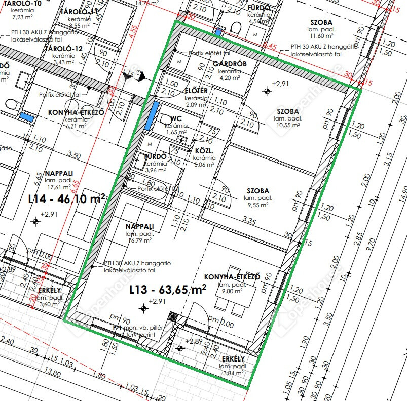 L13 számú lakás: 1. emeleti 63,65 m2 alapterületű, 2 szoba nappali elrendezésű, 3,84 m2 erkéllyel.