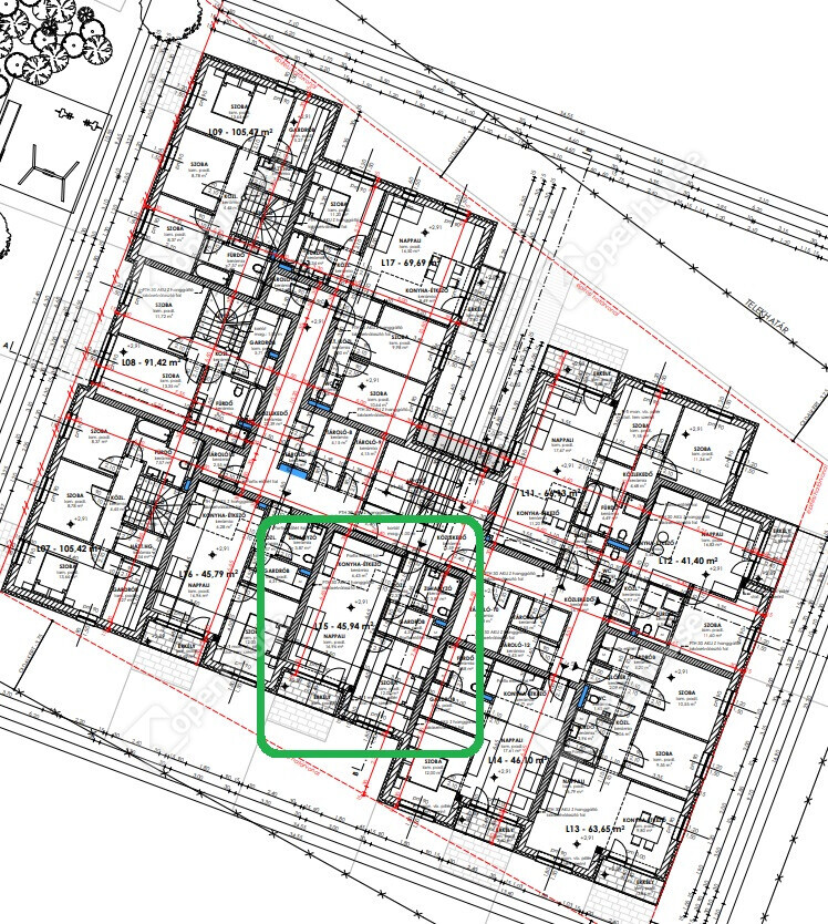 L15 számú lakás: 1. emeleti 45,94 m2 alapterületű, 1 szoba nappali elrendezésű, 3,6 m2 erkéllyel.
