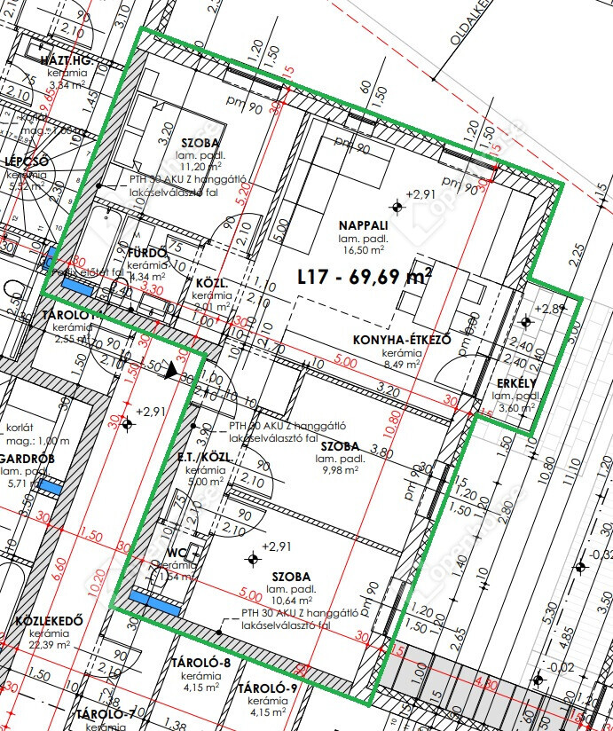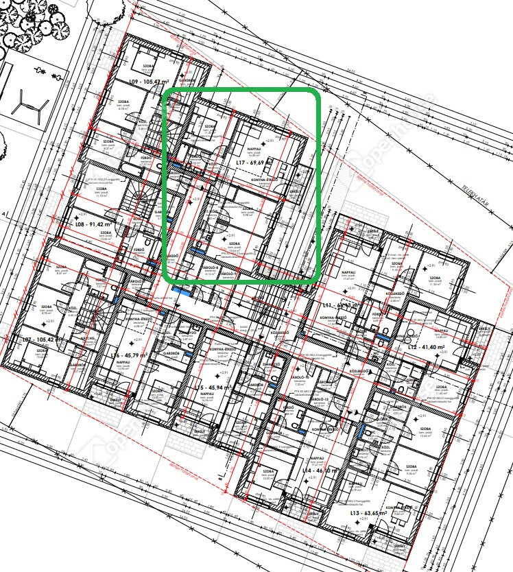 L17 számú lakás: 1. emeleti 69,69 m2 alapterületű, 3 szoba nappali elrendezésű, 3,6 m2 erkéllyel.
