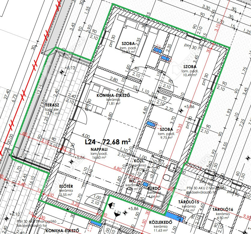 L24 számú lakás: 2. emeleti 72,68 m2 alapterületű, 3 szoba nappali elrendezésű, 13,11 m2 terasszal.