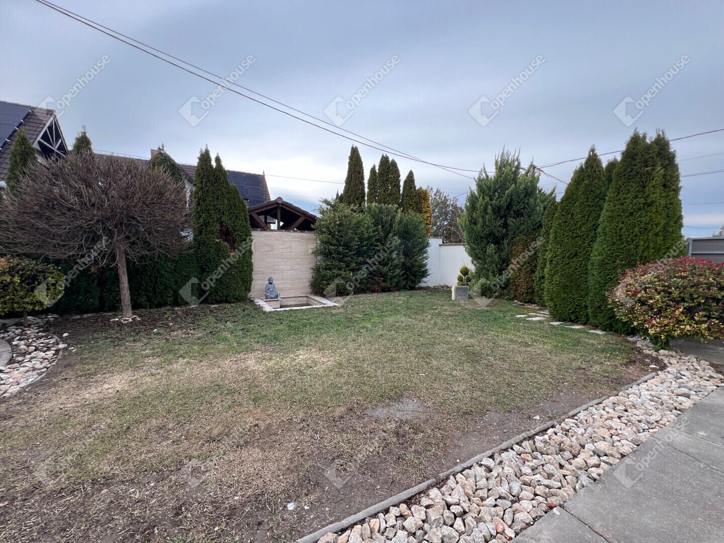 Az elektromos kapun áthaladva gondozott, térkövezett udvar és kellemes kert fogadja a hazaérkezőket – igazi nyugalomsziget a Balaton közelében.