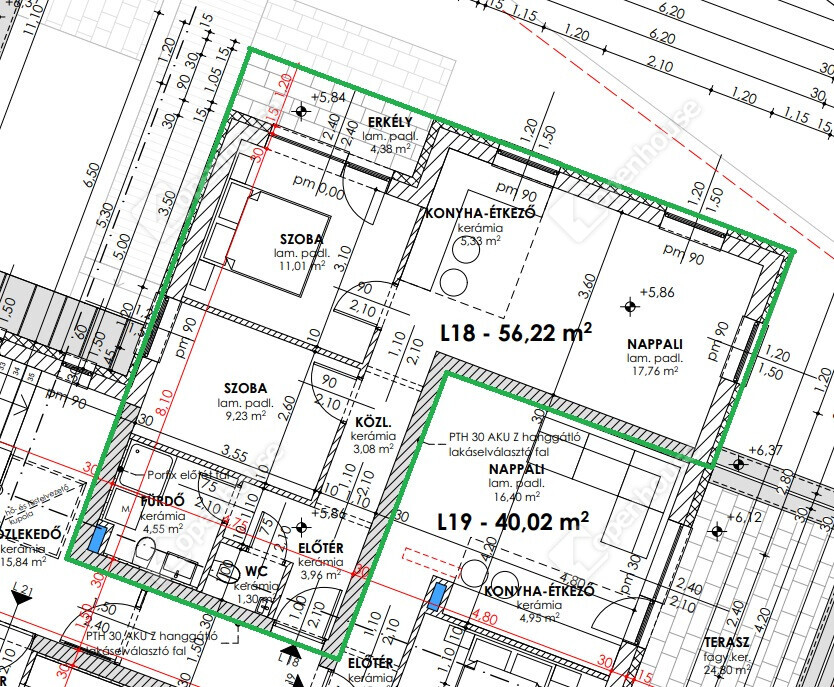 L18 számú lakás: 2. emeleti 56,22 m2 alapterületű, 2 szoba nappali elrendezésű, 4,38 m2 erkéllyel.