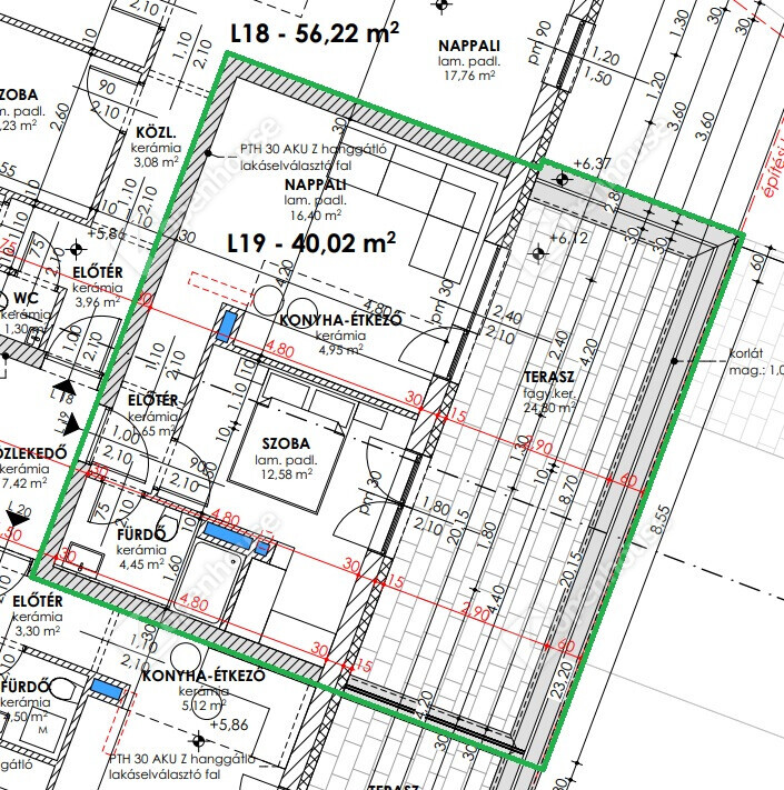 L19 számú lakás: 2. emeleti 40,02 m2 alapterületű, 2 szoba nappali elrendezésű, 24,8 m2 terasszal.