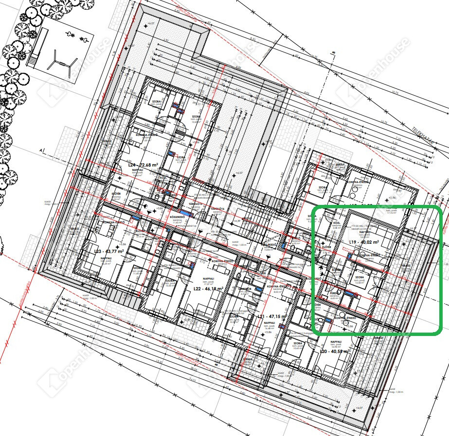 L19 számú lakás: 2. emeleti 40,02 m2 alapterületű, 1 szoba nappali elrendezésű, 24,8 m2 terasszal.