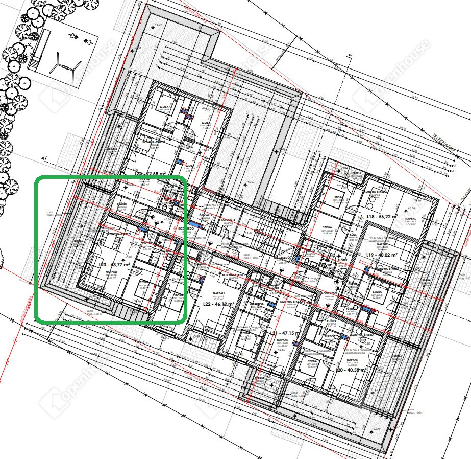 L23 számú lakás: 2. emeleti 43,77 m2 alapterületű, 1 szoba nappali elrendezésű, 24,9 m2 terasszal.