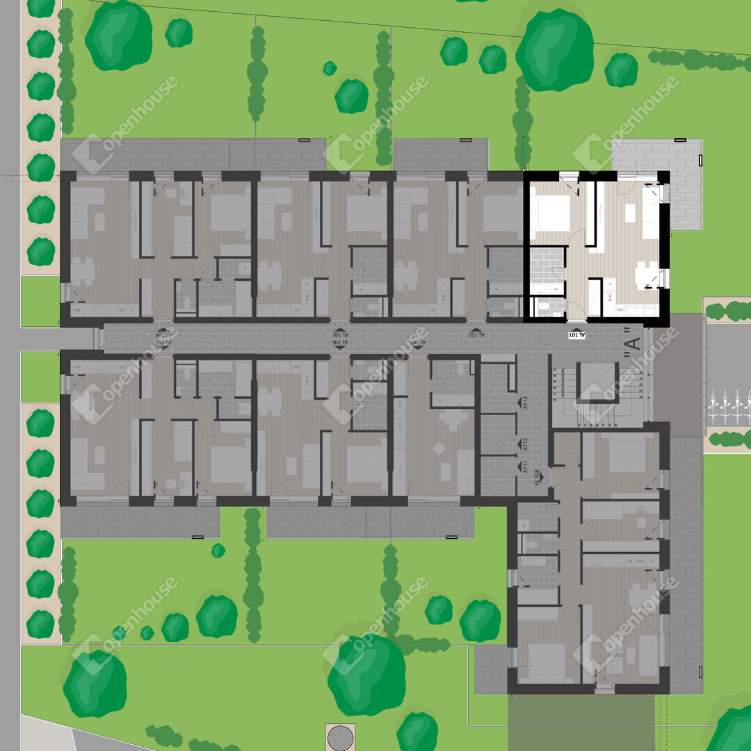 AL101 lakás: 1. emeleti 42,22 m2 alapterületű, 1 szoba nappali elrendezésű, 11,29 m2 erkéllyel.