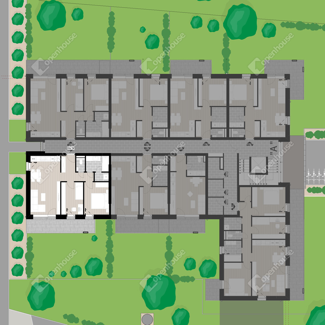 AL105 lakás: 1. emeleti 58,2 m2 alapterületű, 2 szoba nappali elrendezésű, 12,46 m2 erkéllyel.