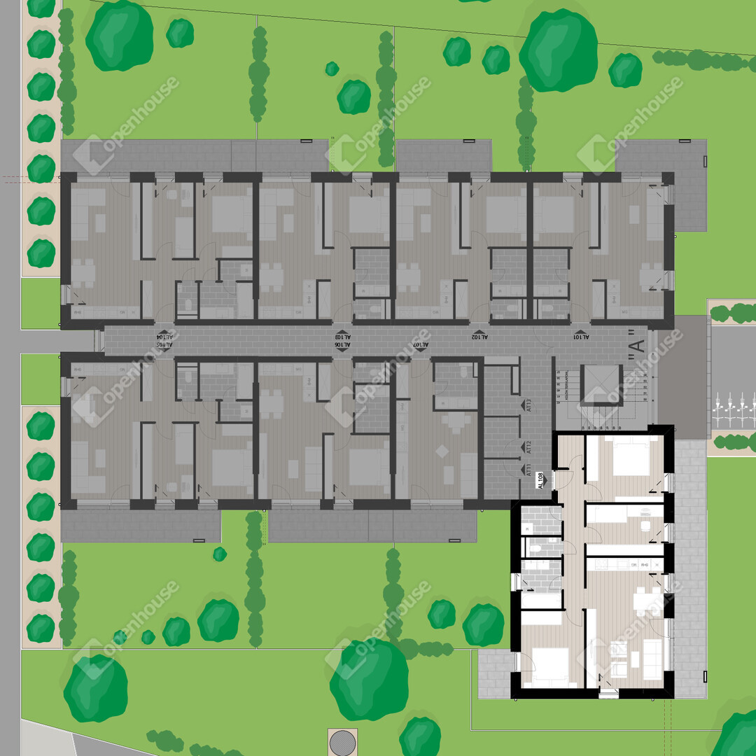 AL108 lakás: földszinti 78,84 m2 alapterületű, 3 szoba nappali elrendezésű, 23,62 m2 erkéllyel.