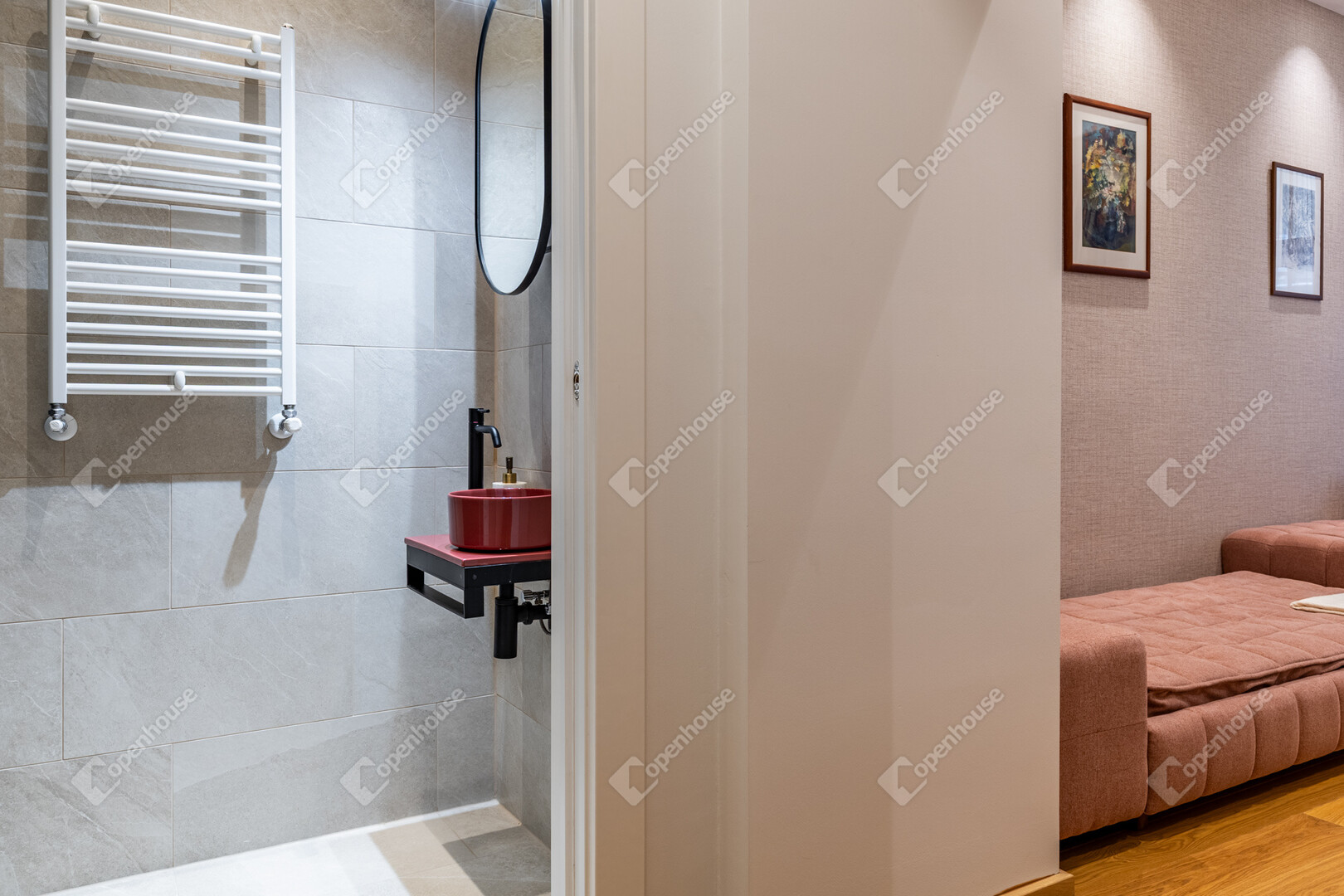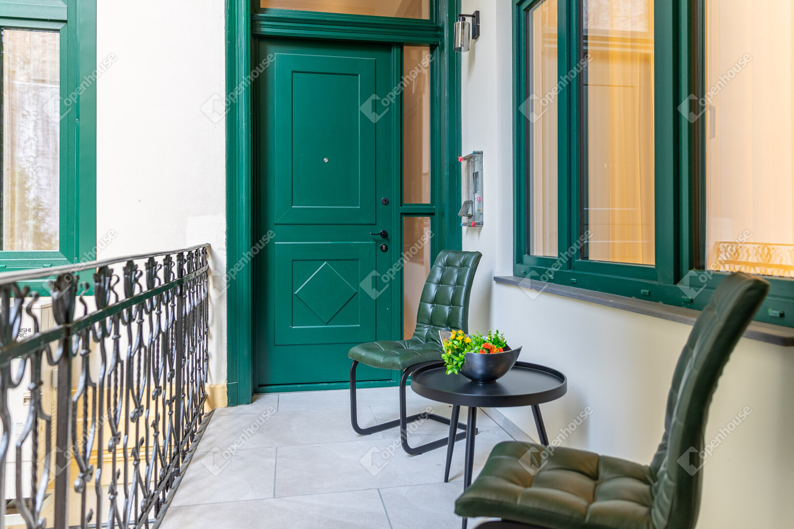 A bejárat előtt egy privát, zárható rész fogadja az érkezőt – egy intim kültéri tér, amely teraszként funkcionál, és már az ajtó előtt megadja a lakás exkluzív, külön világát.