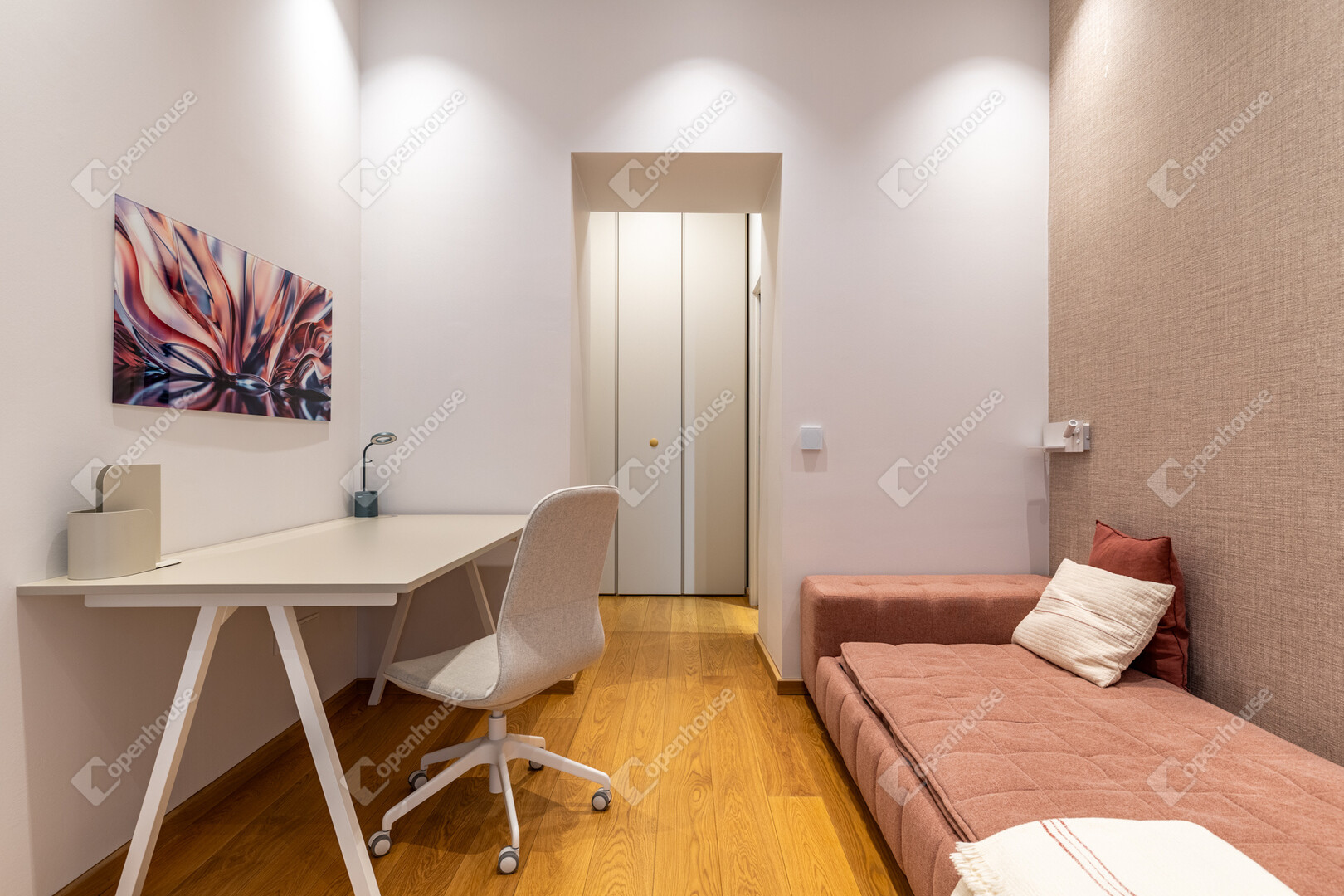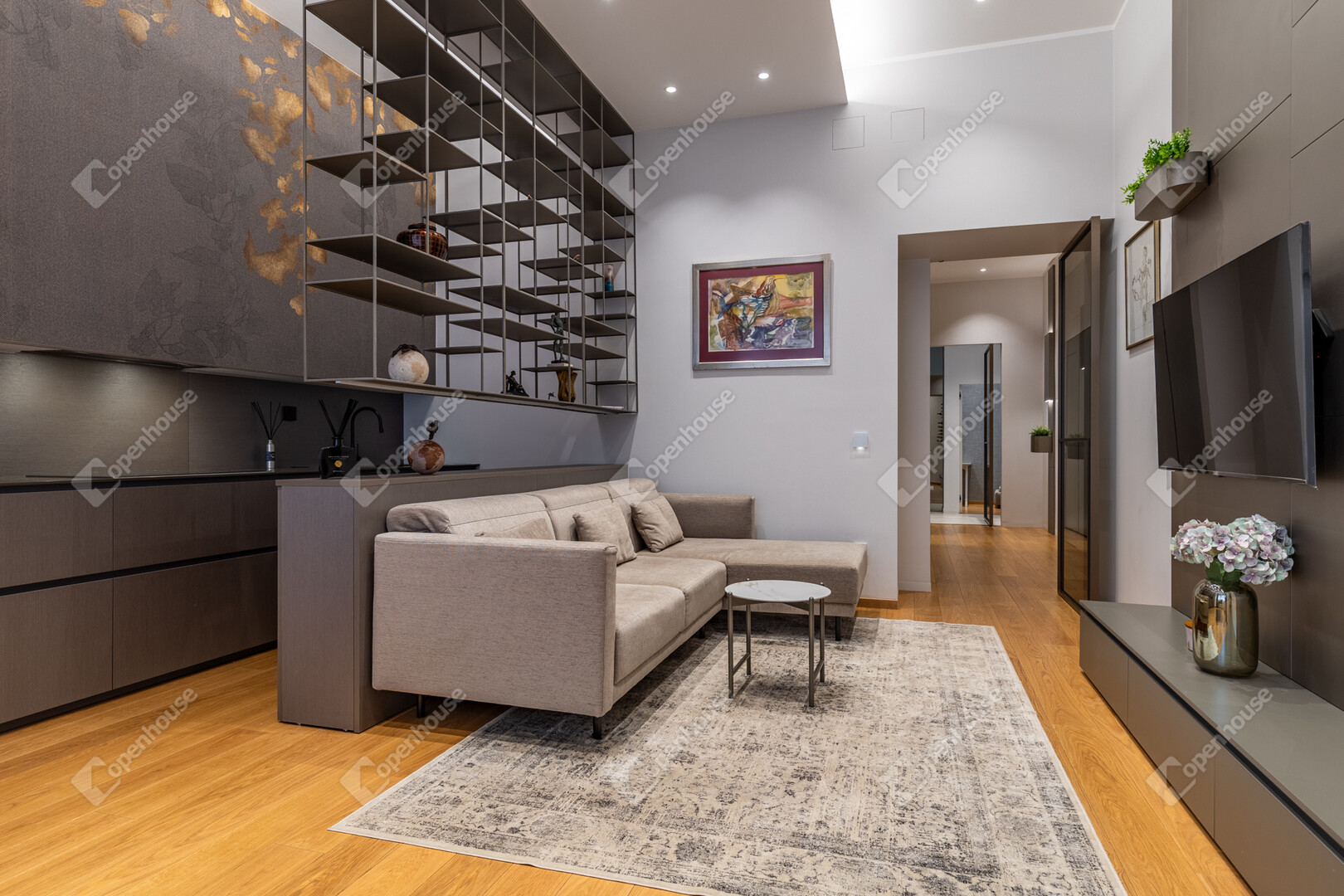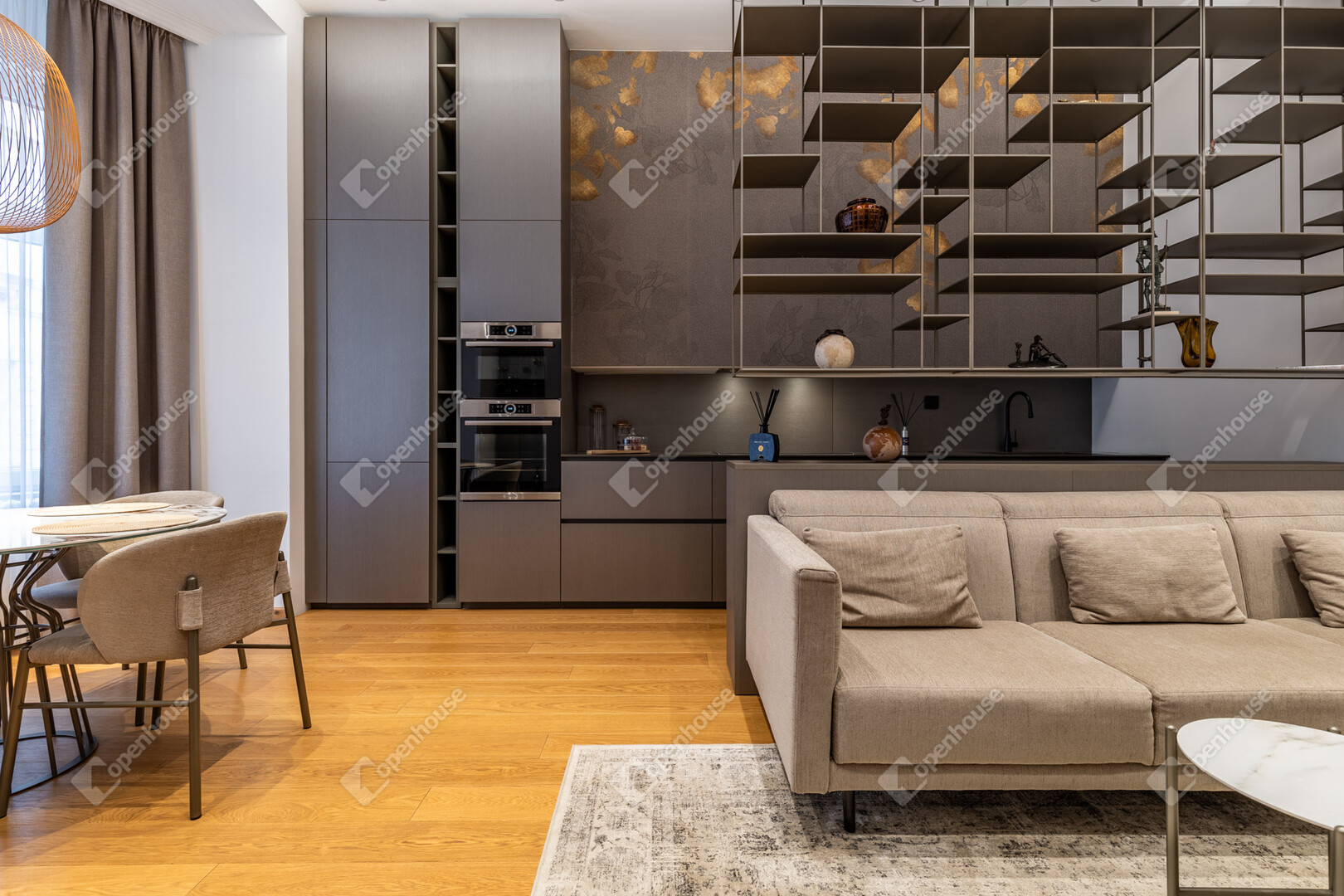 A lakás minden helyiségében egyedileg gyártott beépített bútorok találhatók, a belsőépítész tervei alapján kialakítva.