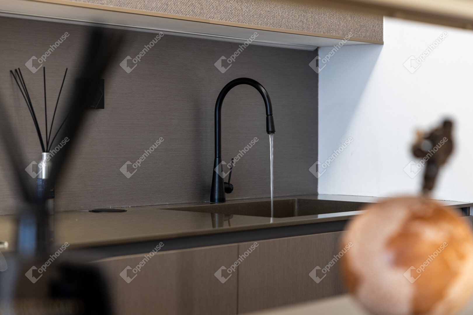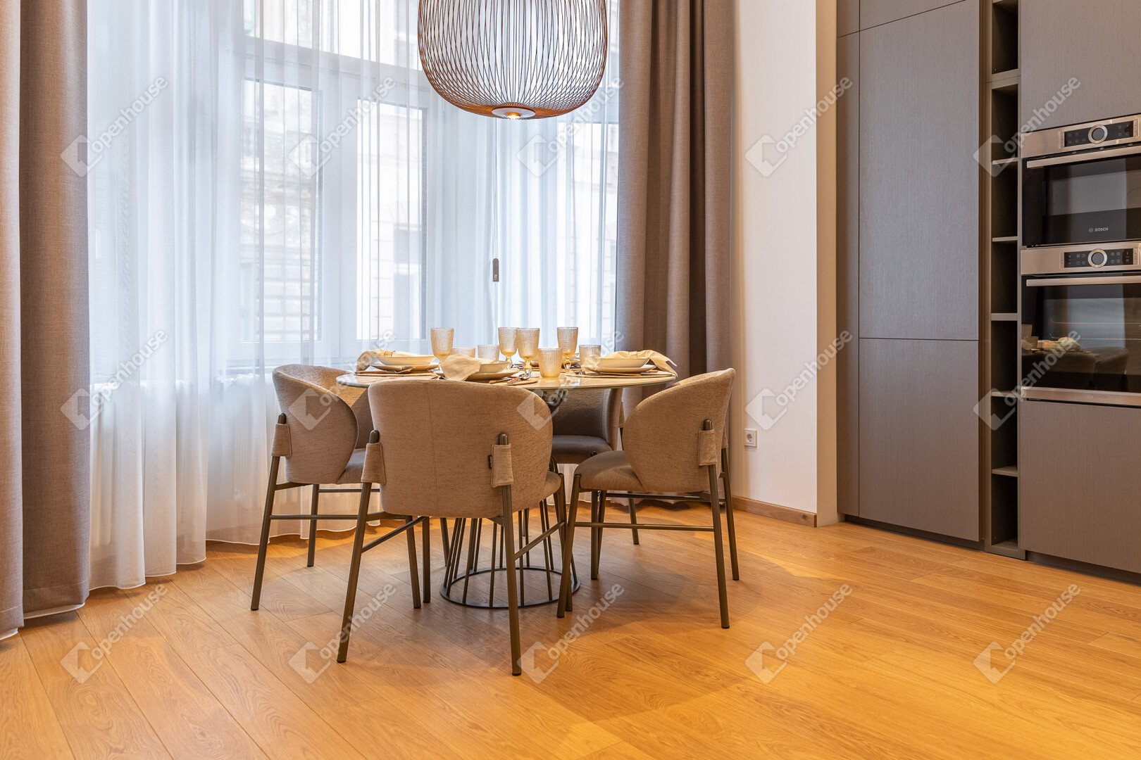 A konyha prémium minőségű beépített gépekkel felszerelt - Bosch készülékekkel, és végig a belsőépítész által megtervezett, egyedi konyhabútorral.