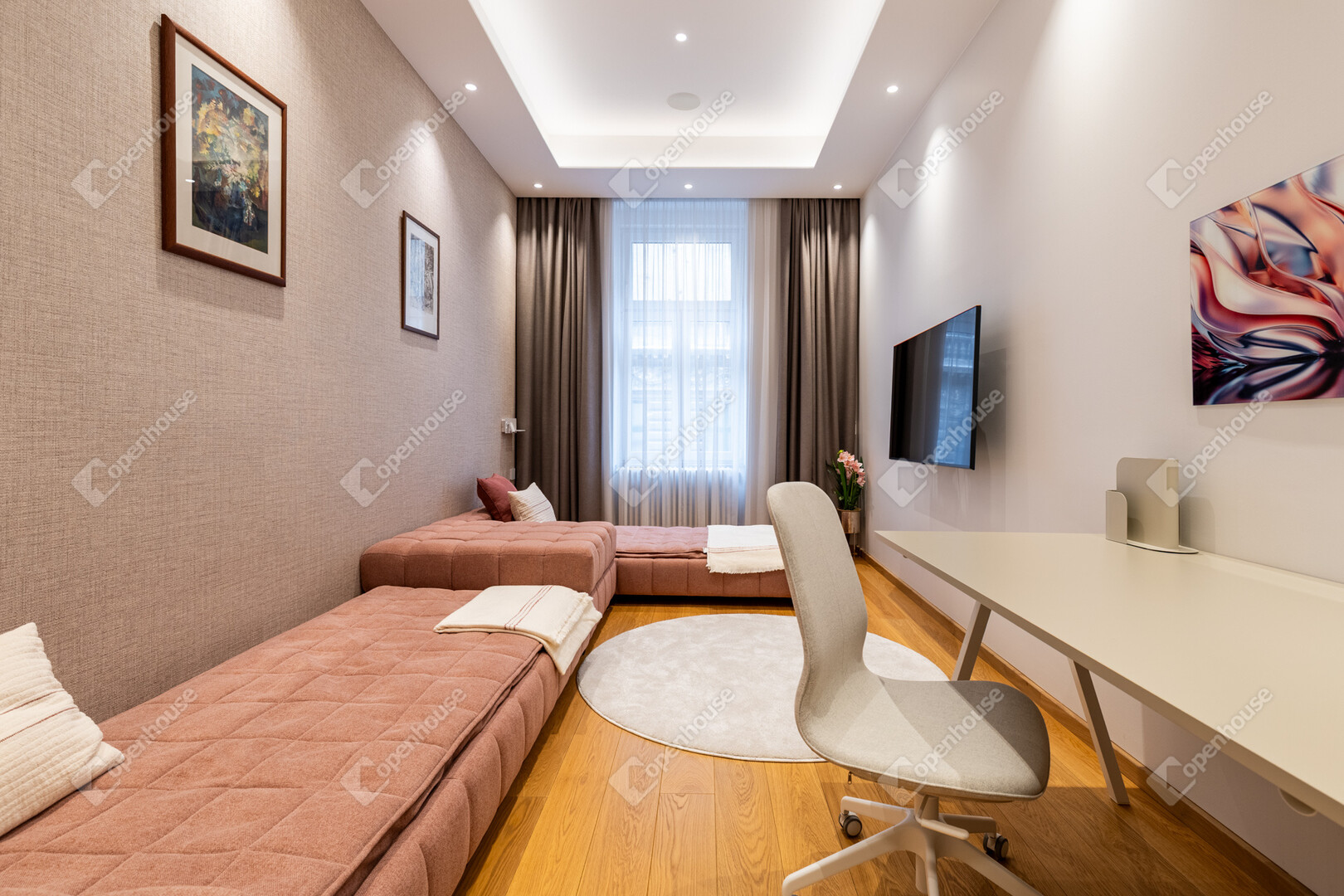 A lakás két gyerekszobával rendelkezik, mindegyik saját funkcionális háttérrel: az egyik gyerekszoba önálló lakrész, zuhanyzós fürdővel és gardróbbal, a másik gyerekszoba egy külön, kádas fürdőszobához kapcsolódik.