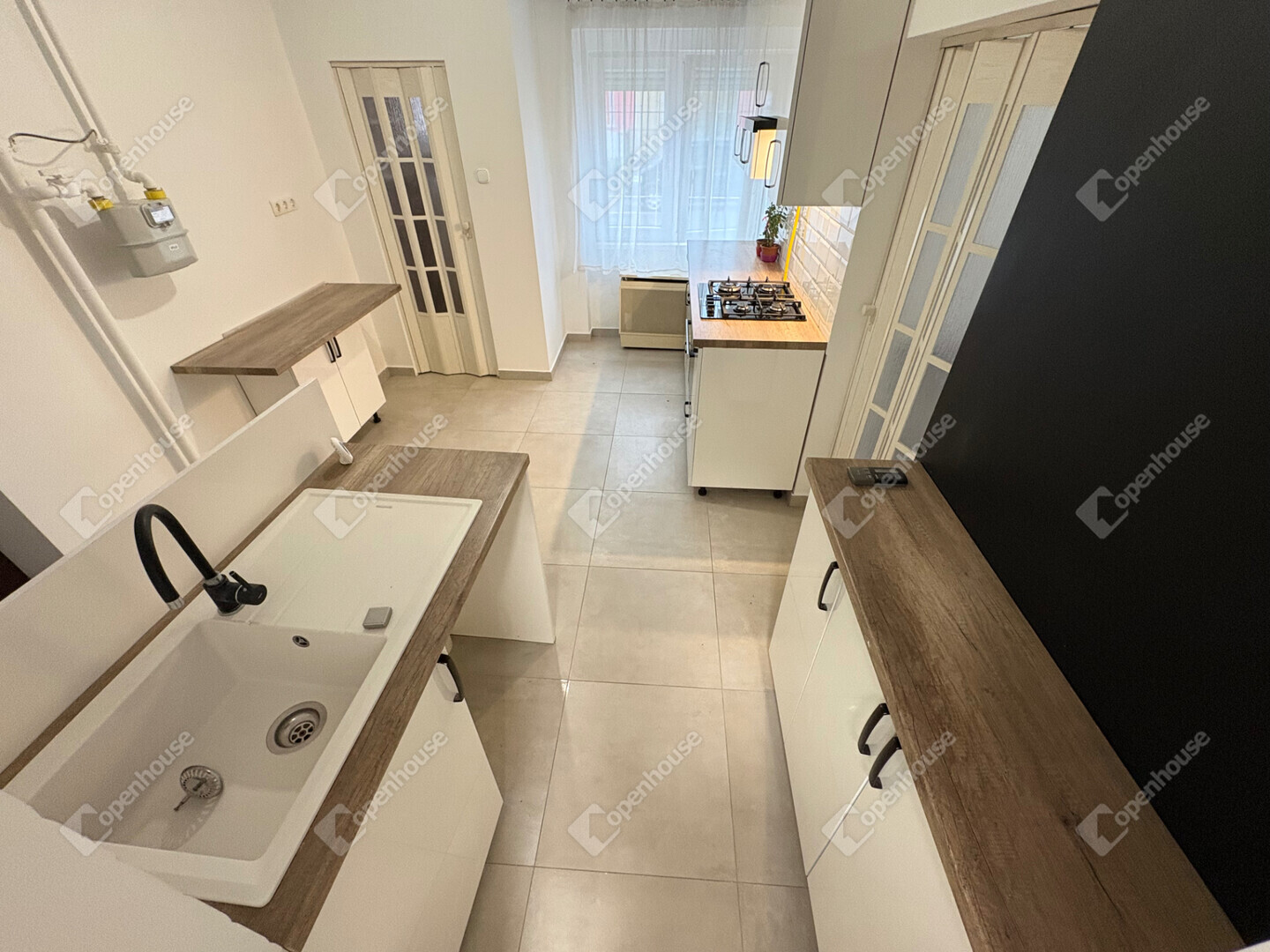 Modern konyha gáztűzhellyel és villanysütővel van felszerelve.