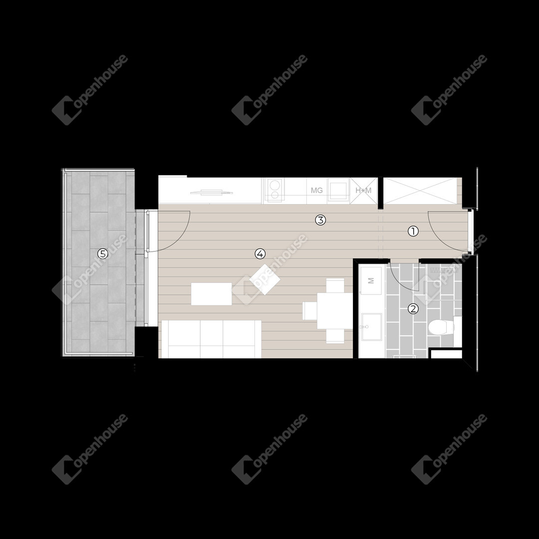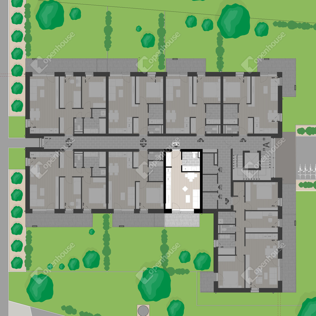 AL207 lakás: 2. emeleti 26,61 m2 alapterületű garzon, 6,54 m2 erkéllyel.
