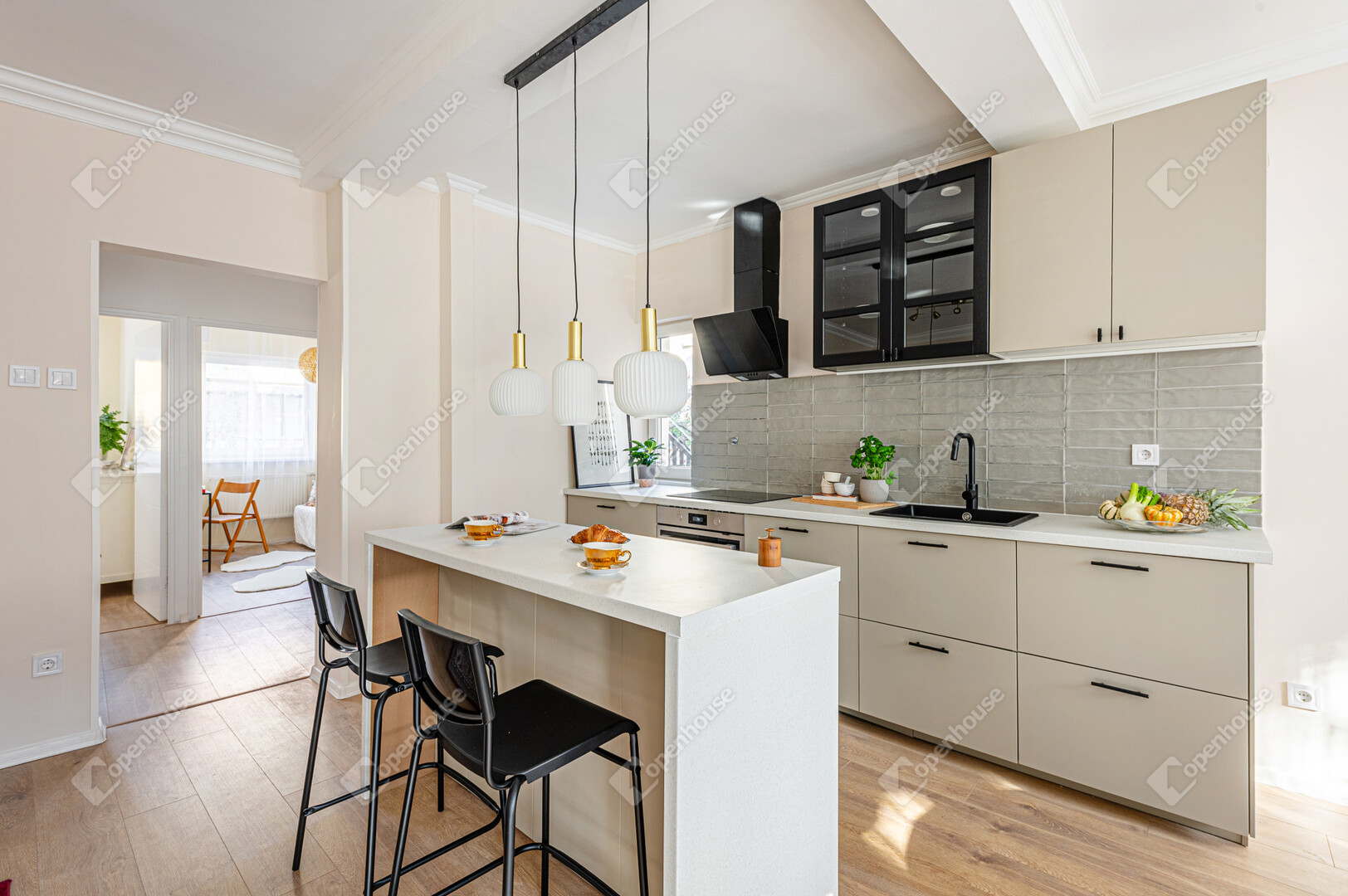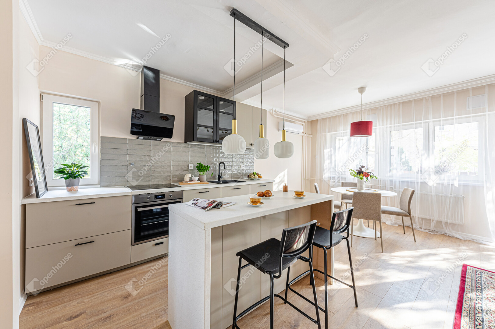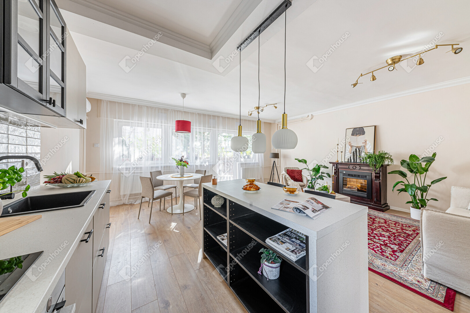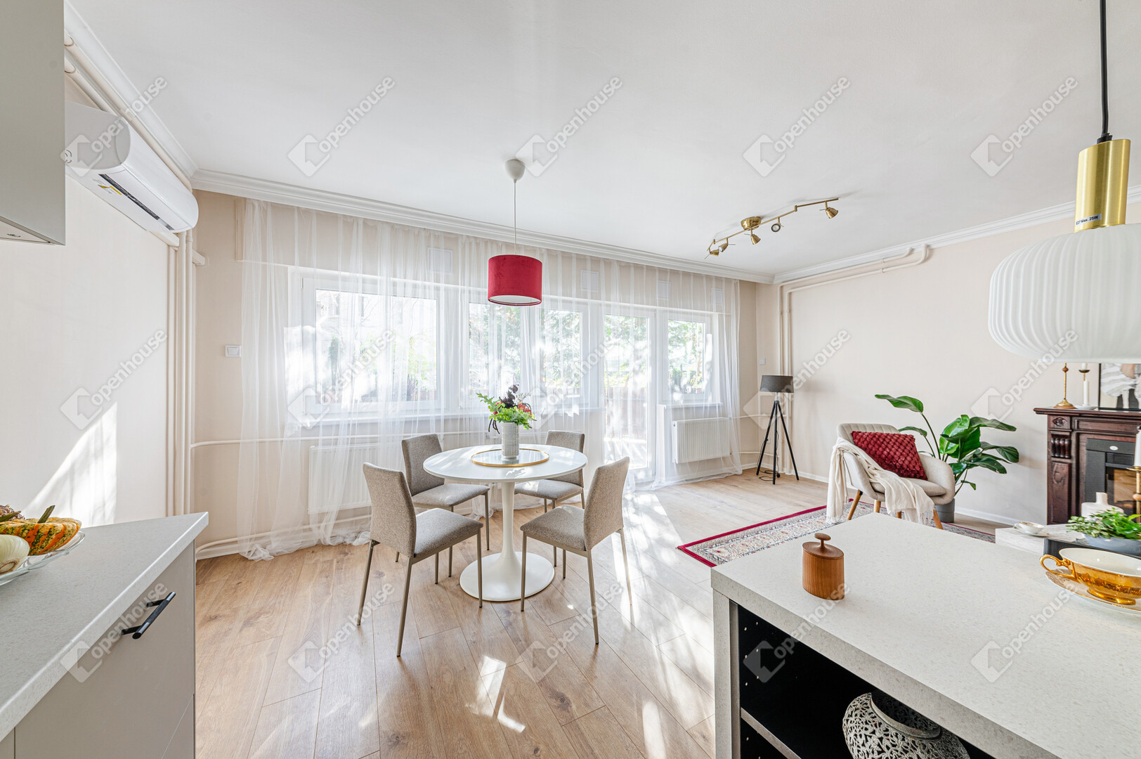 Amerikai konyhás, napfényes nappali, 2 külön nyíló hálószoba