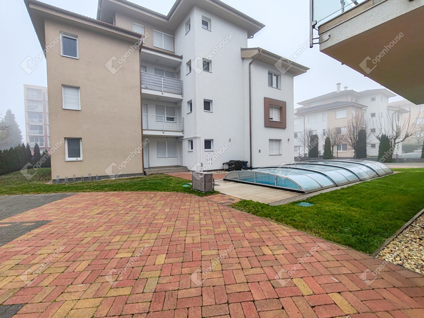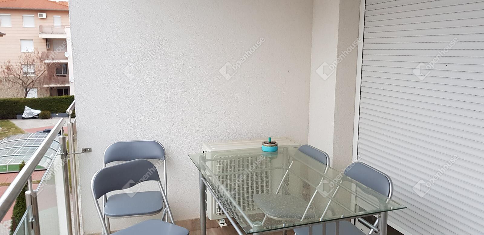 A lakás világos és jól tagolt, ablakai a medencére és az utcára néznek, így egyszerre élvezhető a nyaralóhangulat és a városi kényelem.