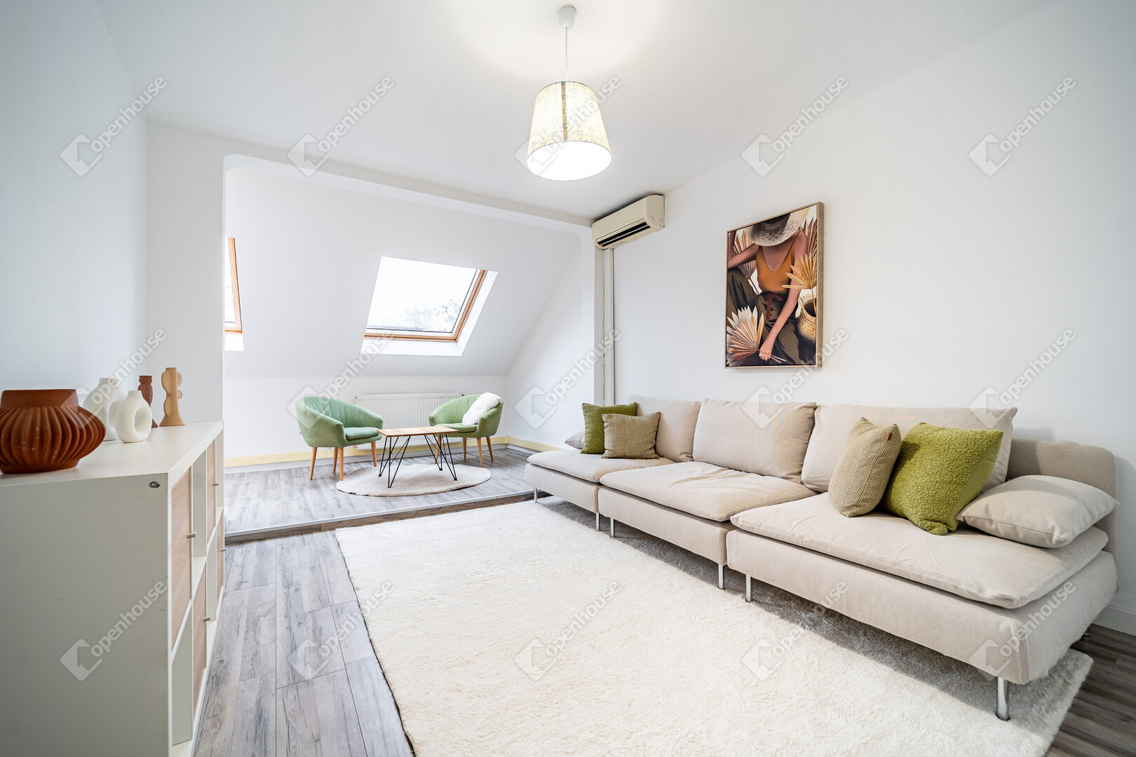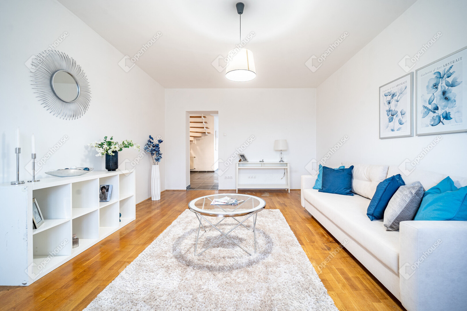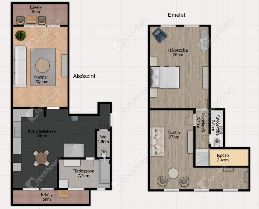 •Alsó szint: nappali, konyha étkezővel, kádas fürdőszoba, külön mosdó (67m2+ 2 erkély (11 m²)