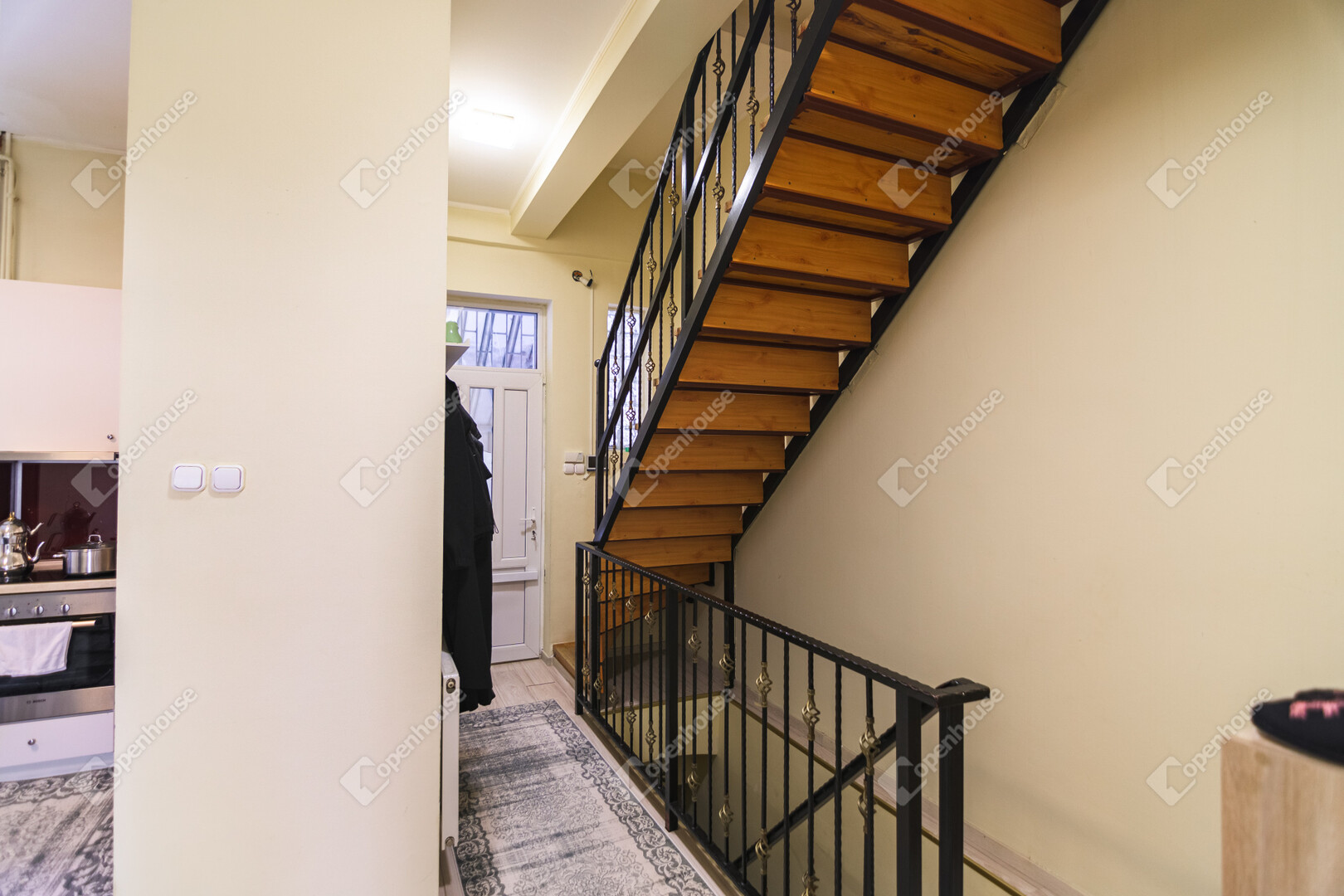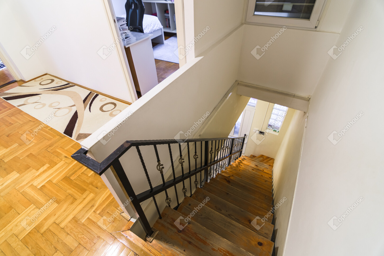 A földszinten található a konyha étkező, egy utcai nézetű nappali, hálószoba és egy fürdőszoba,