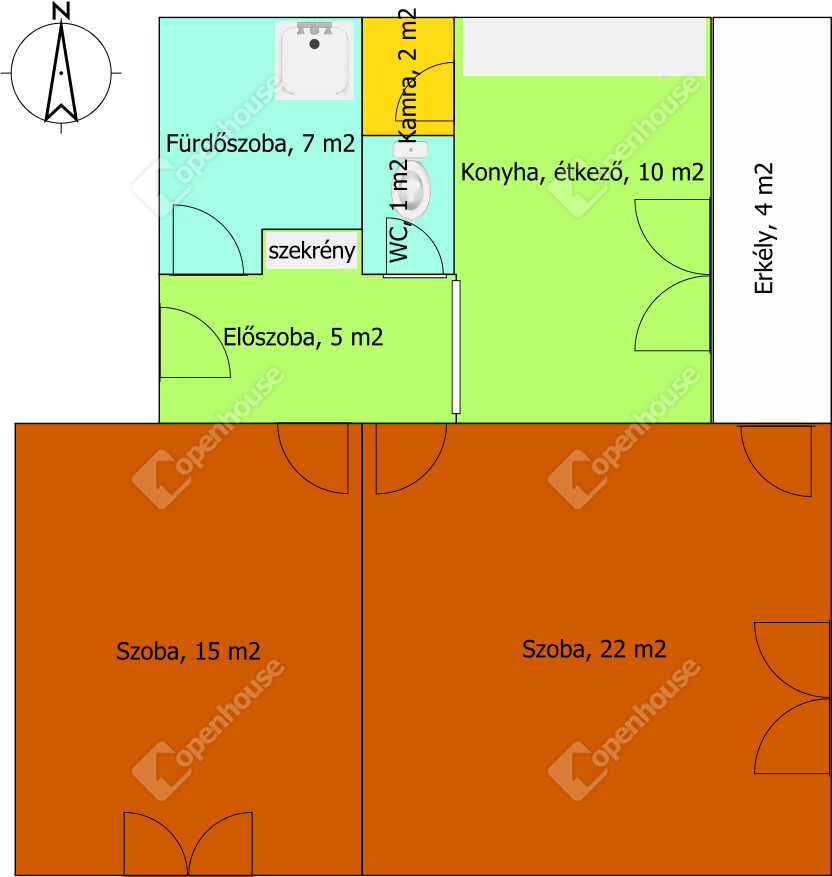 - 2 szoba (22 és 15 m2), konyha és étkező (10 m2), fürdőszoba (7 m2), WC (1 m2), előtér (5 m2), kamra (2 m2),