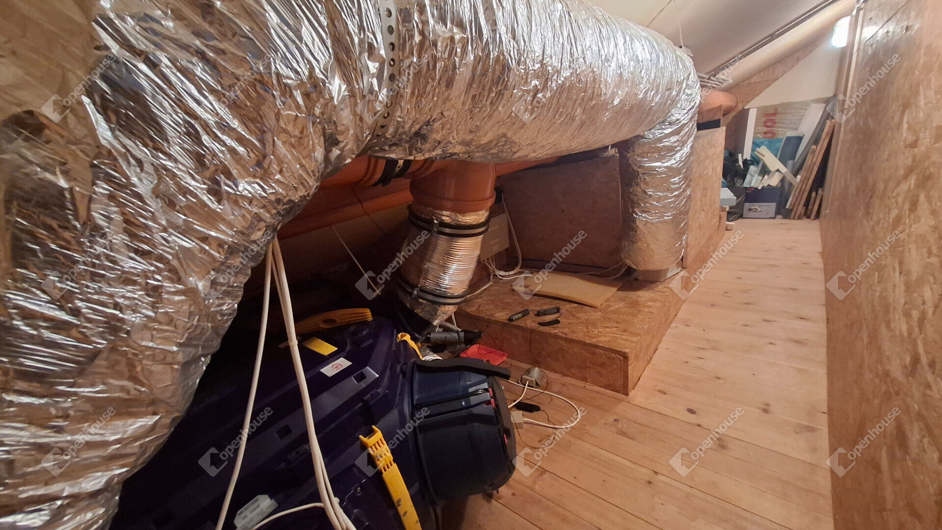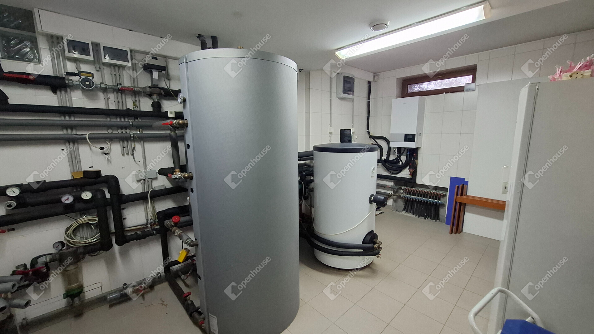 A kazánházban egy 300 literes melegvíztároló és egy 500 literes puffertartály is található.