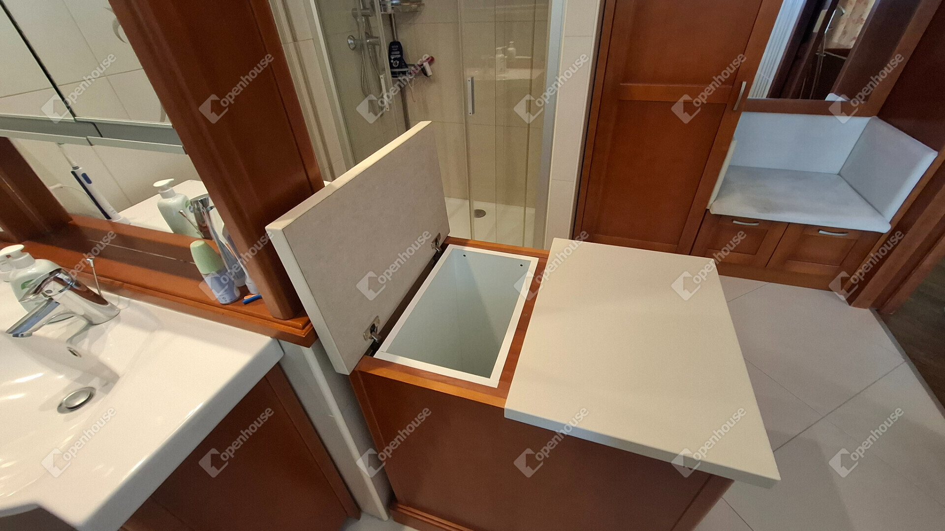 A ház minden helyiségében egységes, prémium minőségű harmonizáló beépített bútorok vannak.