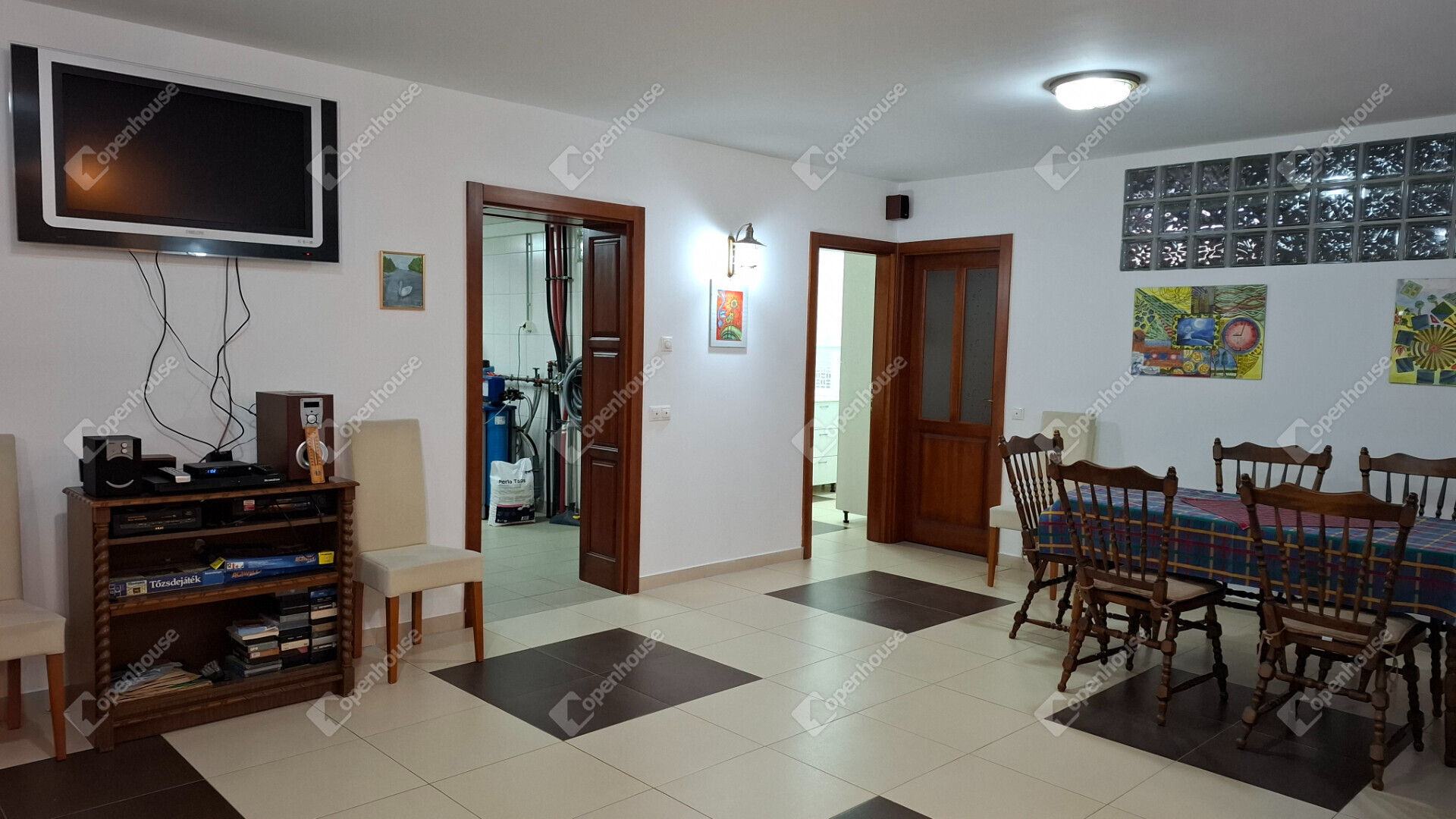 A családi ház földszintje 190 négyzetméter, belépve egy kis előszoba és egy tágas nappali fogad. A nappaliból nyílnak: konditerem, kamra, kazánház, mosókonyha, borospince. A borospincében beépített italos pult és ásott kút is van elektromosan működtethető italos hűtőrendszerrel. Kis külön folyosón fürdőszoba jakuzzival, zuhanyzóval, külön wc, és egy szauna plusz infra kombináció egybeépítve.