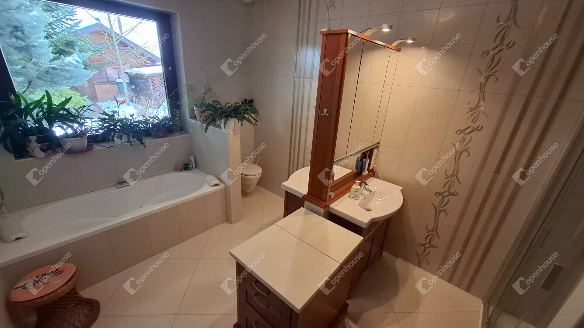 A családi ház felső szintje 170 négyzetméter, a fő nappali egy vizes grillezős kandallóval, egyterű konyha étkezővel, egy nagy terasszal, télikerttel. A nappaliból nyílik a fő hálószoba beépített gardróbbal, saját terasszal, fürdőszobával. A fürdőben két külön mosdóhely, fürdőkád, zuhanyzó, beépített szekrények, szennyes ledobó a lenti mosókonyhába.