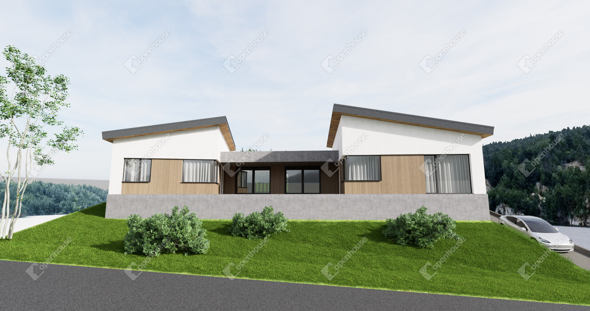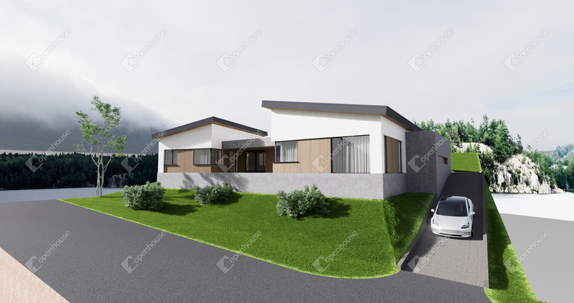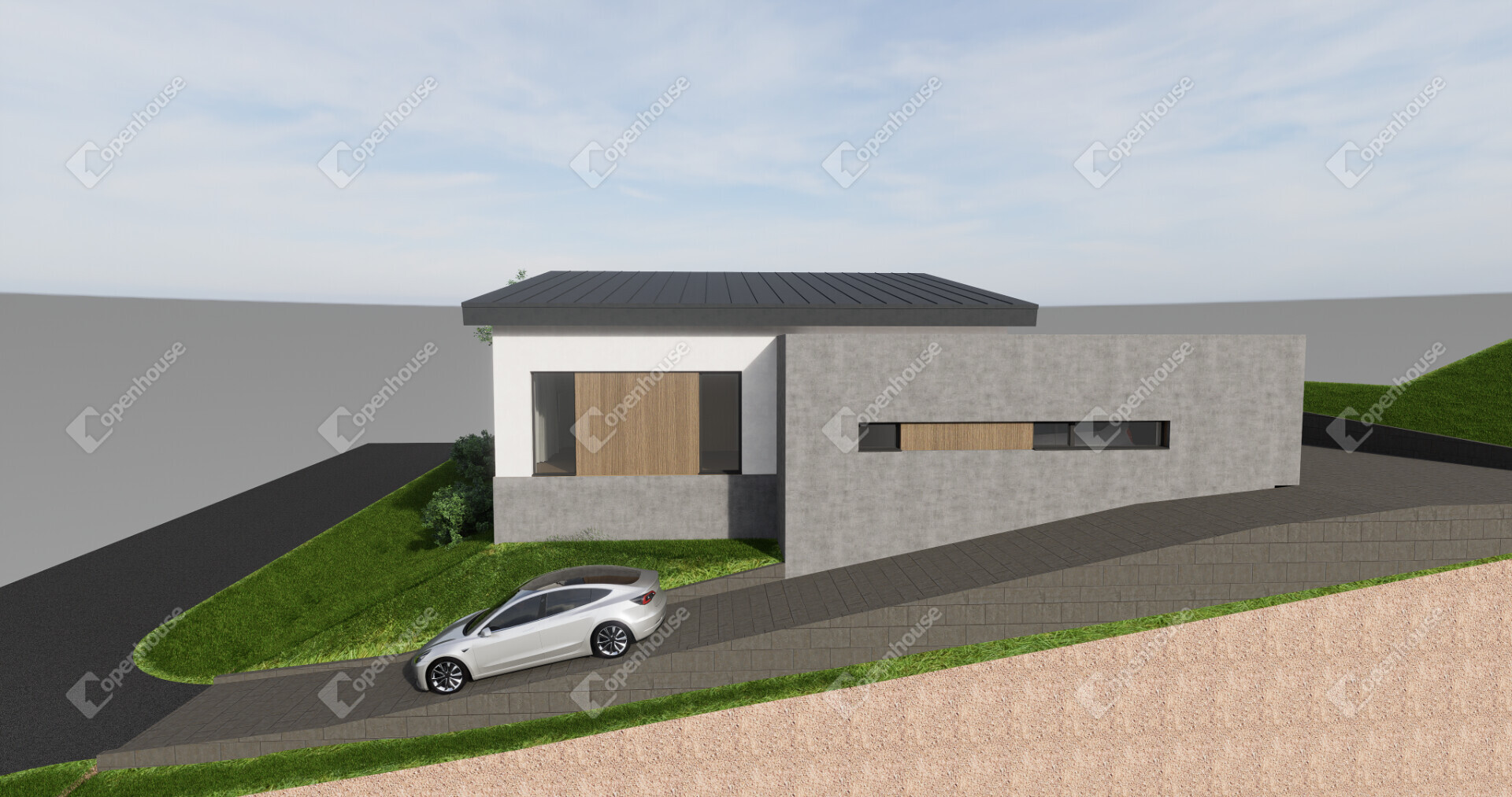 A telekhez modern, minden igényt kielégítő családi ház tervei és jogerős építési engedélye is rendelkezésre áll: