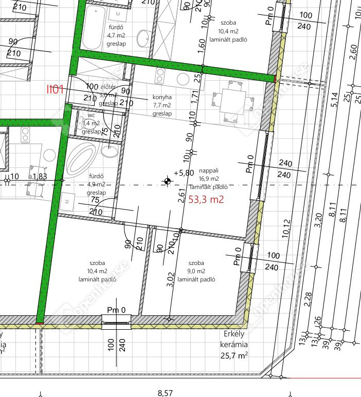 - II.E1-es lakás 53,3 m2 + 25,7 m2 erkély