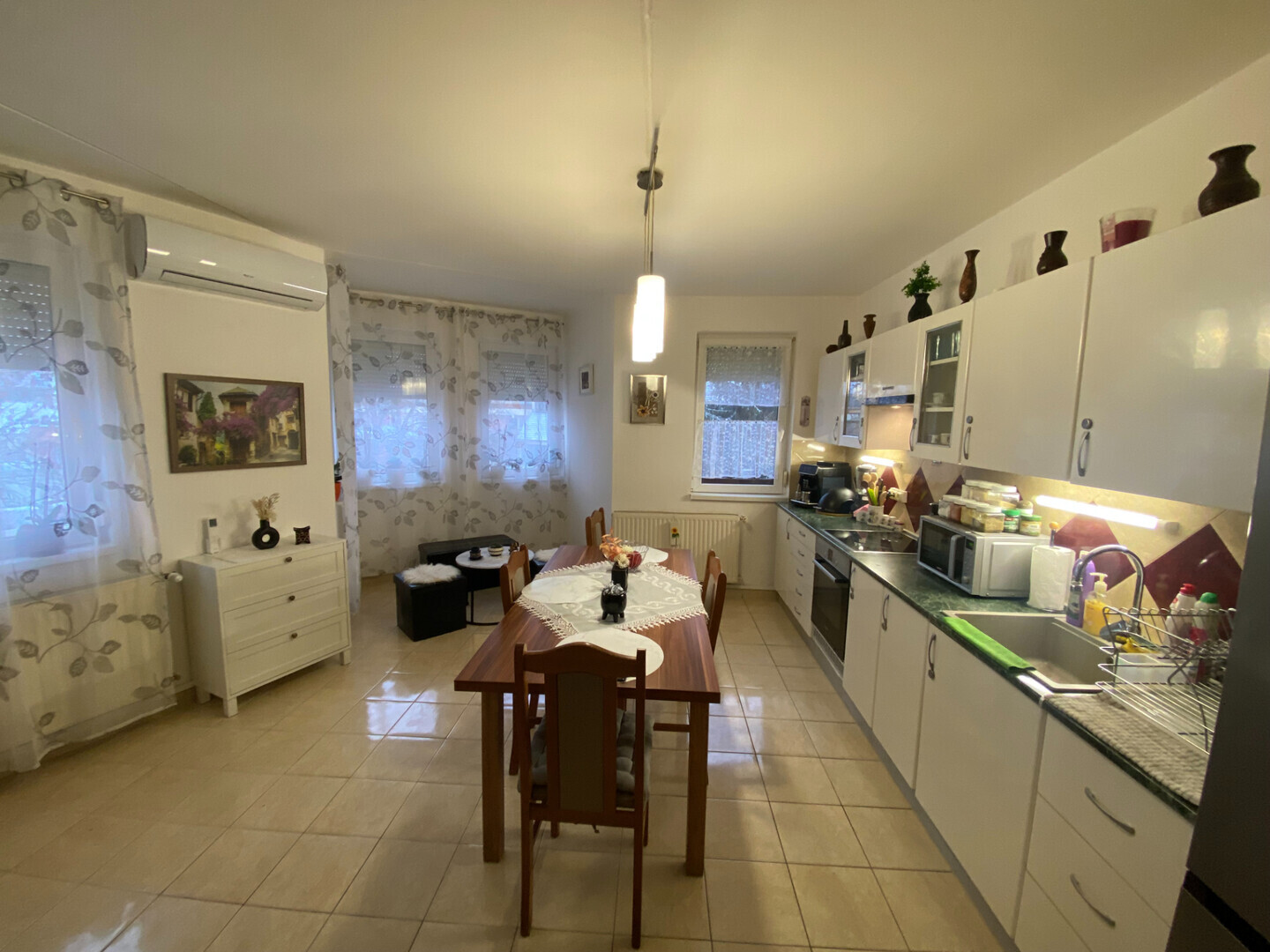 Tágas konyha étkezővel, nappalival