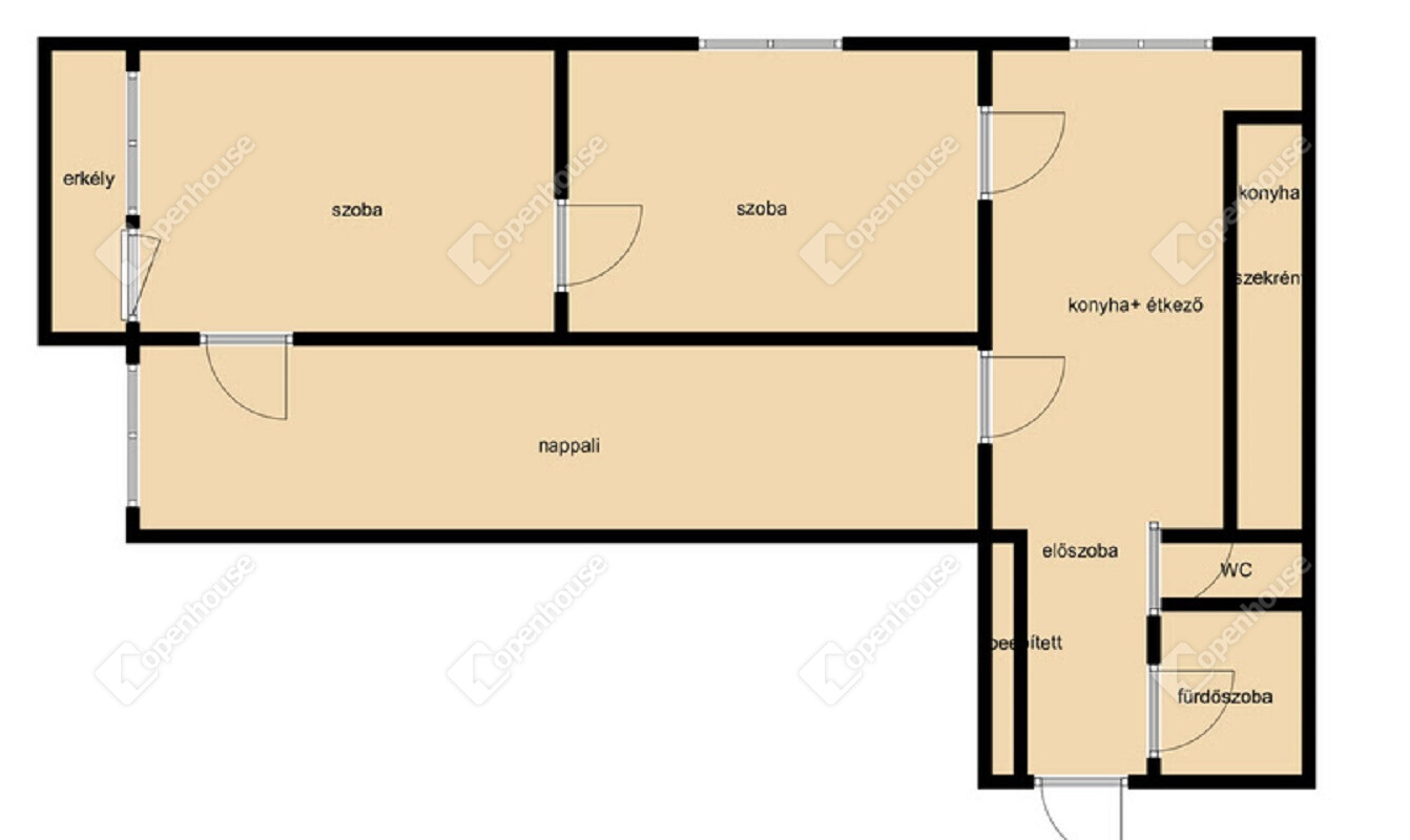 - A lakásban egy nappali, két szoba, előszoba, konyha étkező egy légtérben, fürdőszoba, WC külön helységben található.