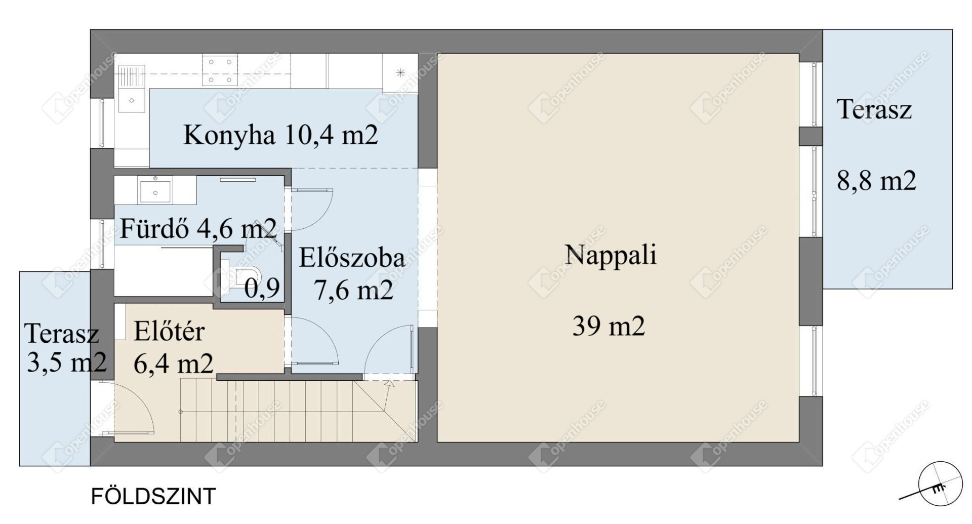 A ház 2 terasszal rendelkezik, egy 3,5 m2-el a bejárati ajtónál, az utcafront felé, míg egy csaknem 9 m2 DNY-i fekvésű, kertre néző terasz.