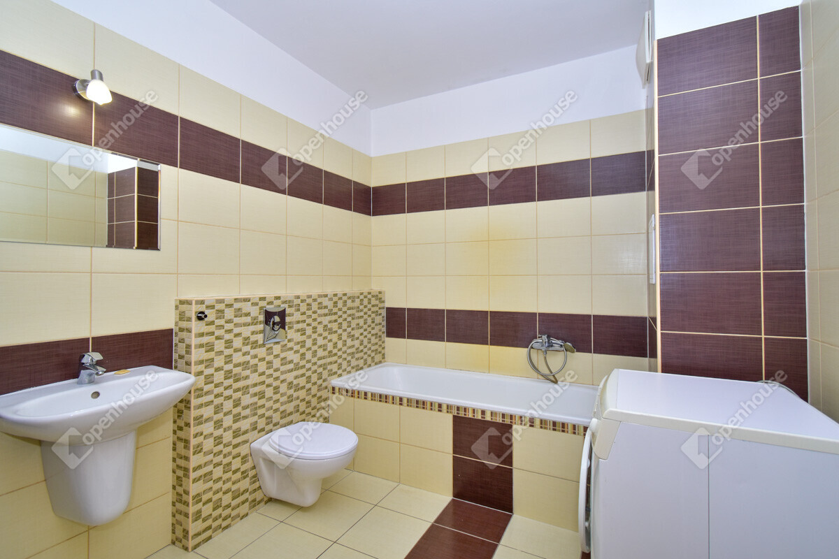 Nagy méretű fürdőszoba káddal, mosógéppel