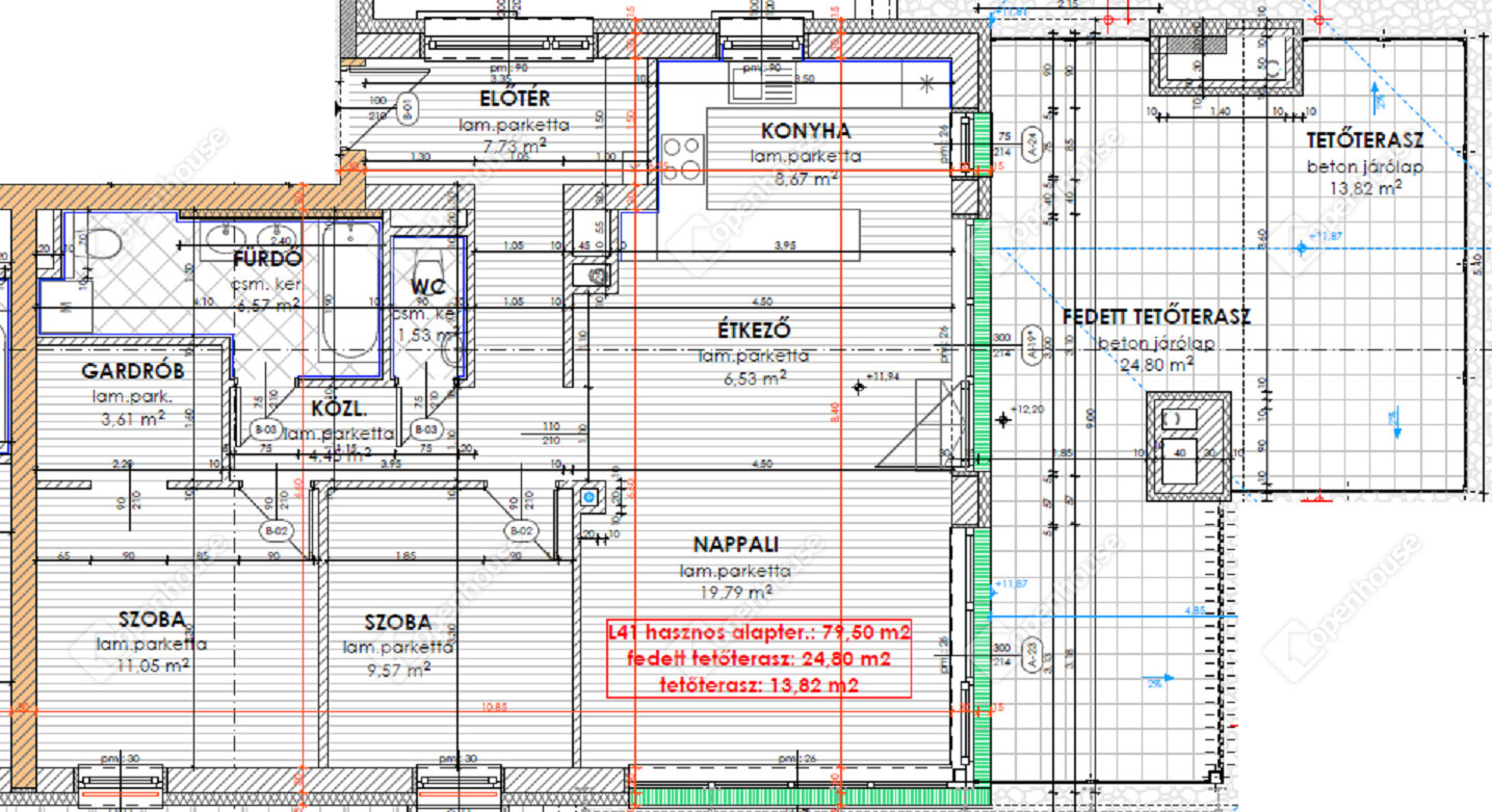 - nettó 79,05 m2-es lakás + 24,8 m2-es fedett erkély + 13,82 tetőterasz