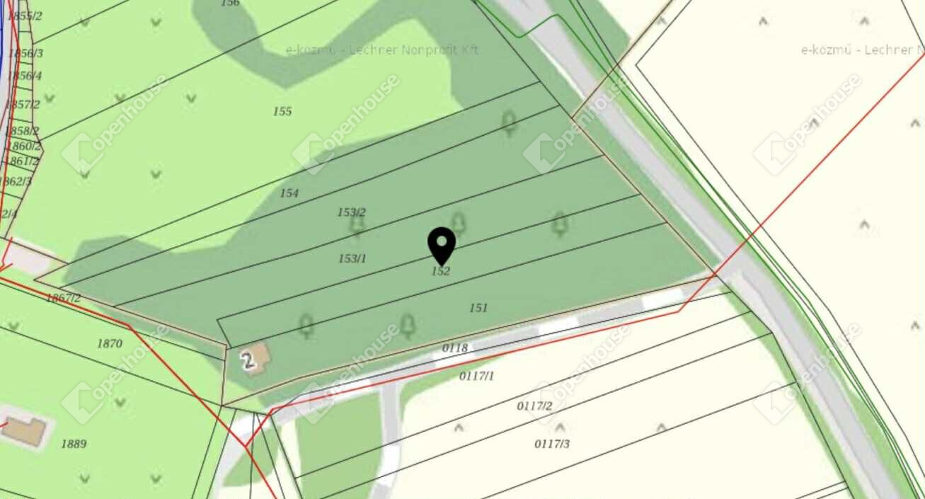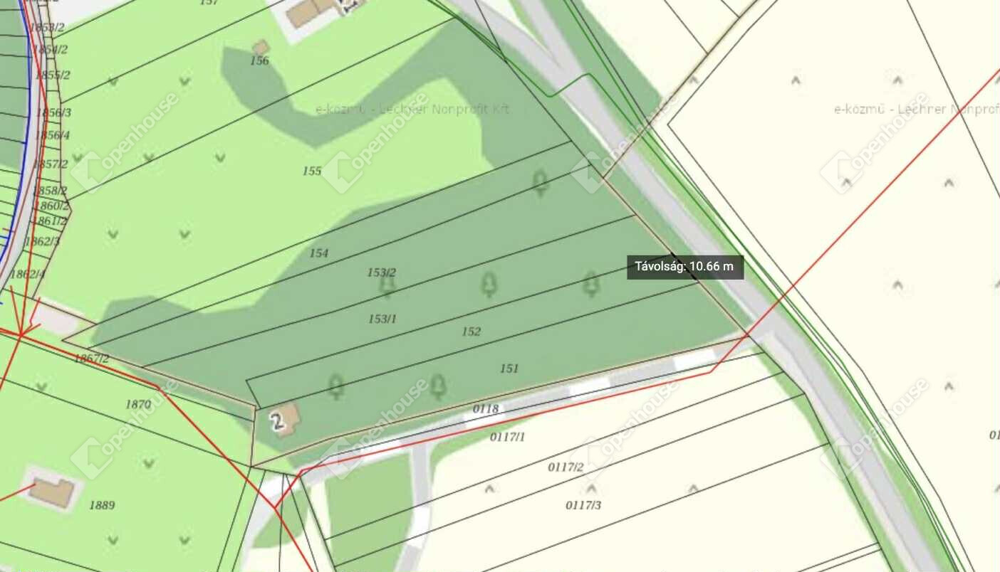 A telek kb. 10 méter széles utcafronttal és 1152 m² területtel rendelkezik.
